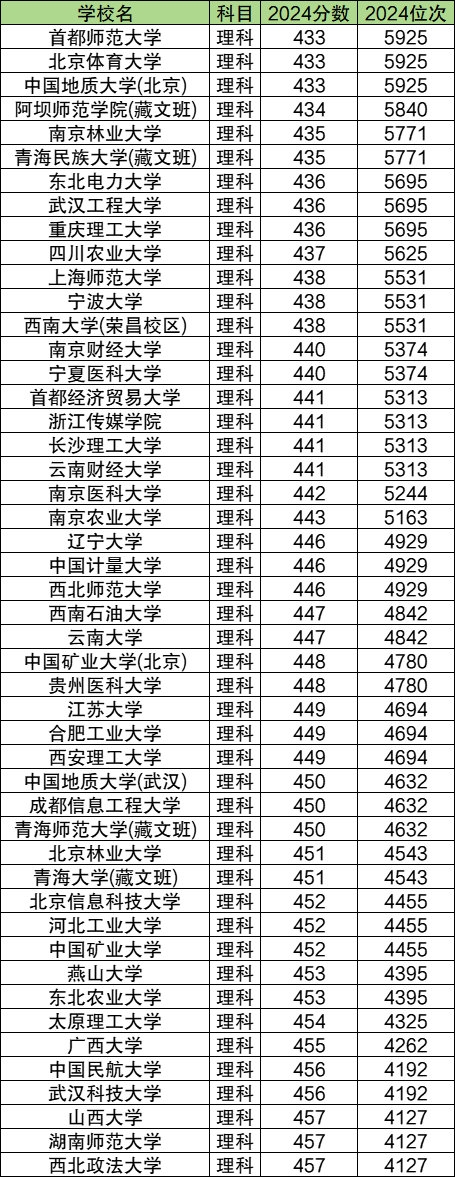 位次在5000左右的基本属于211或省重点院校,分数在433-457分之间,比一本线高90-114分。其中位次相对靠后的有首都师范大学、北京体育大学、中国地质大学(北京)、阿坝师范学院(藏文班)、南京林业大学。