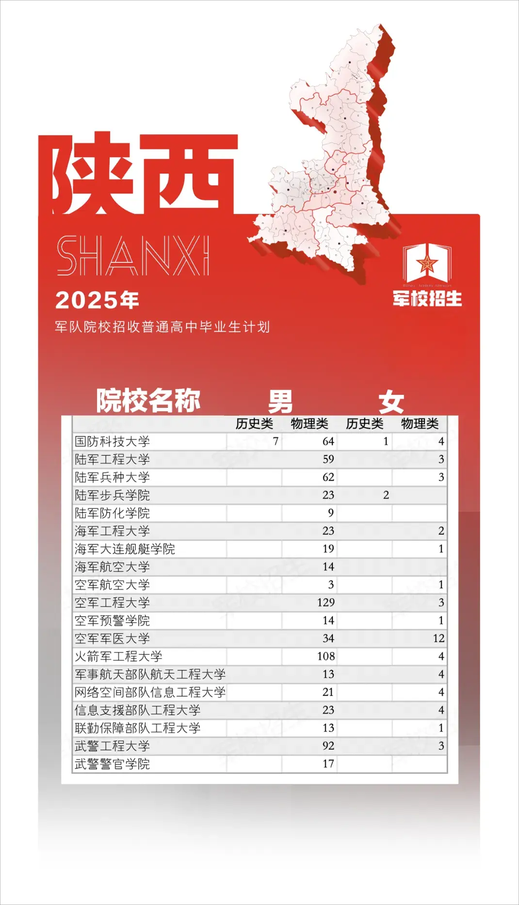 2025年全国19所军校在陕西招生计划总人数为866人,其中男生788人、女生78人。下面是各个军校招生人数情况汇总: