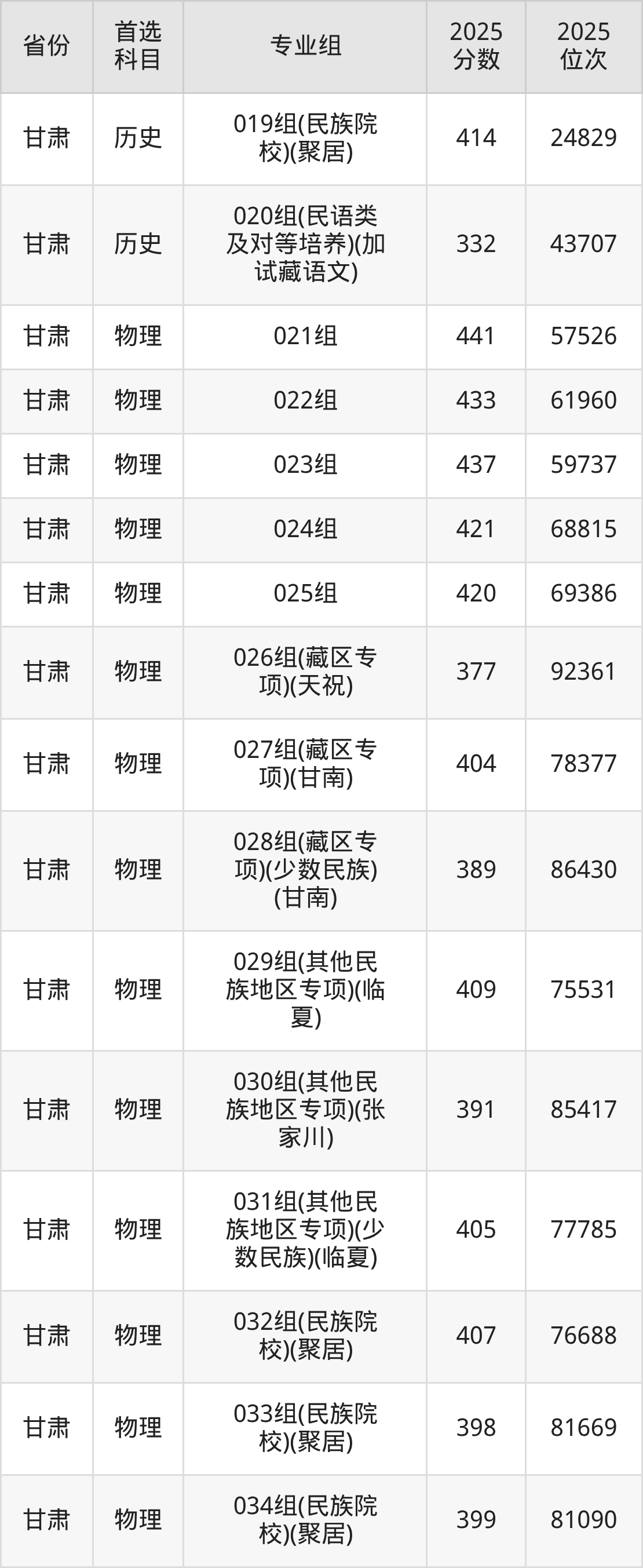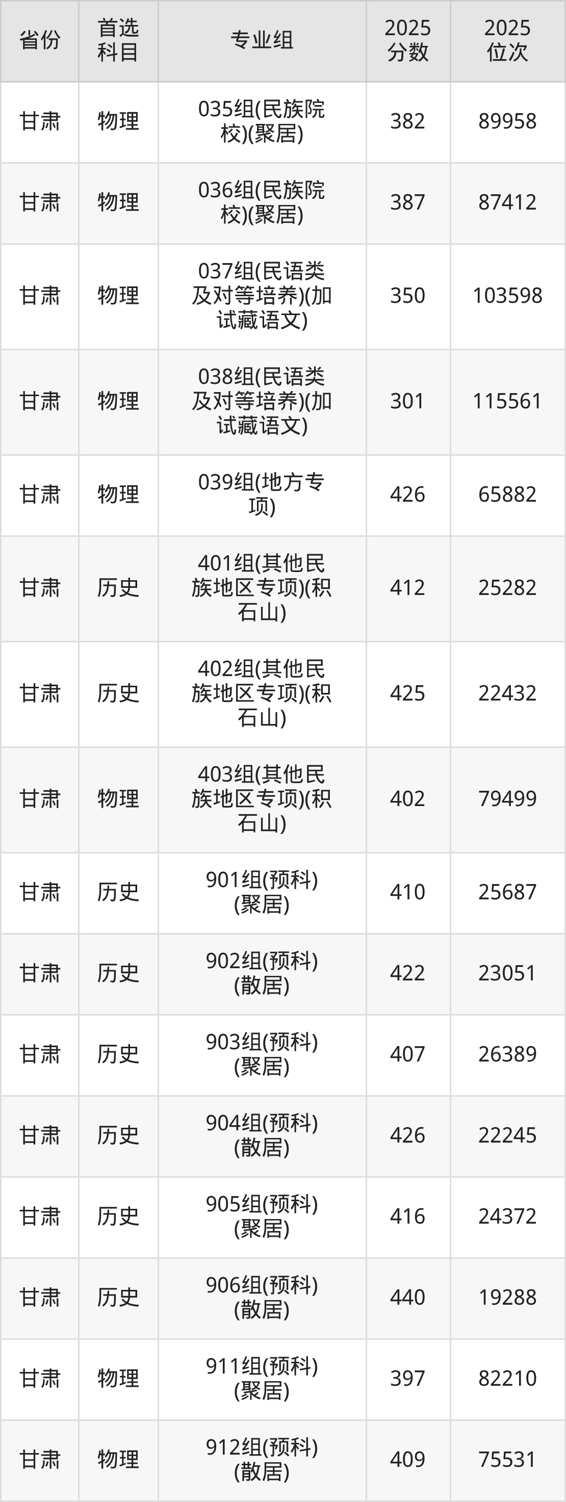 因为大部分地区目前只公布了院校(专业组)分数线,为了方便2026年考生参考,本文就整理出甘肃民族师范学院在全国各省不同科类的最低分:
