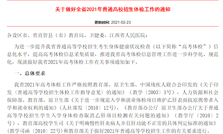 意思就是江西省2021年高考体检将于3月份开始,原则上应该在3月底结束。所以具体体检时间还是各学校自己决定。