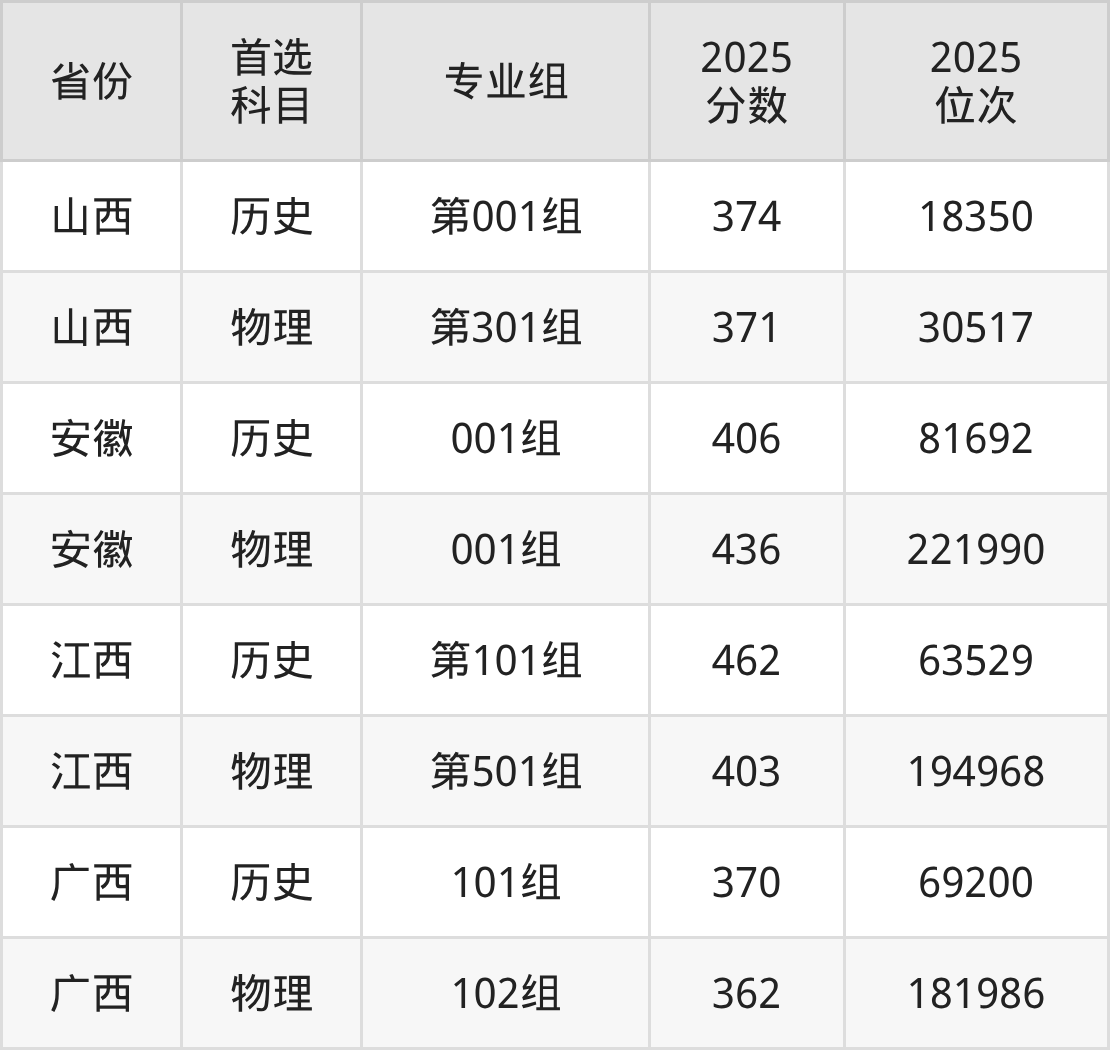 因为大部分地区目前只公布了院校(专业组)分数线,为了方便2026年考生参考,本文就整理出杭州万向职业技术学院在全国各省不同科类的最低分: