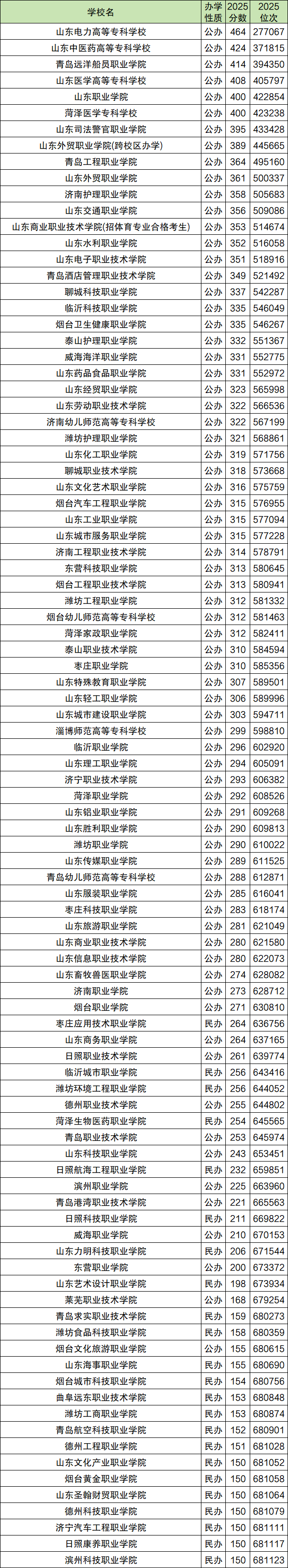 2025年山东所有专科大学录取分数线是150分到464分之间,最难考的是山东电力高等专科学校,二段最低分为464分、位次是277067名。最好考的是滨州科技职业学院,2025年最低分150,位次是681123名。
