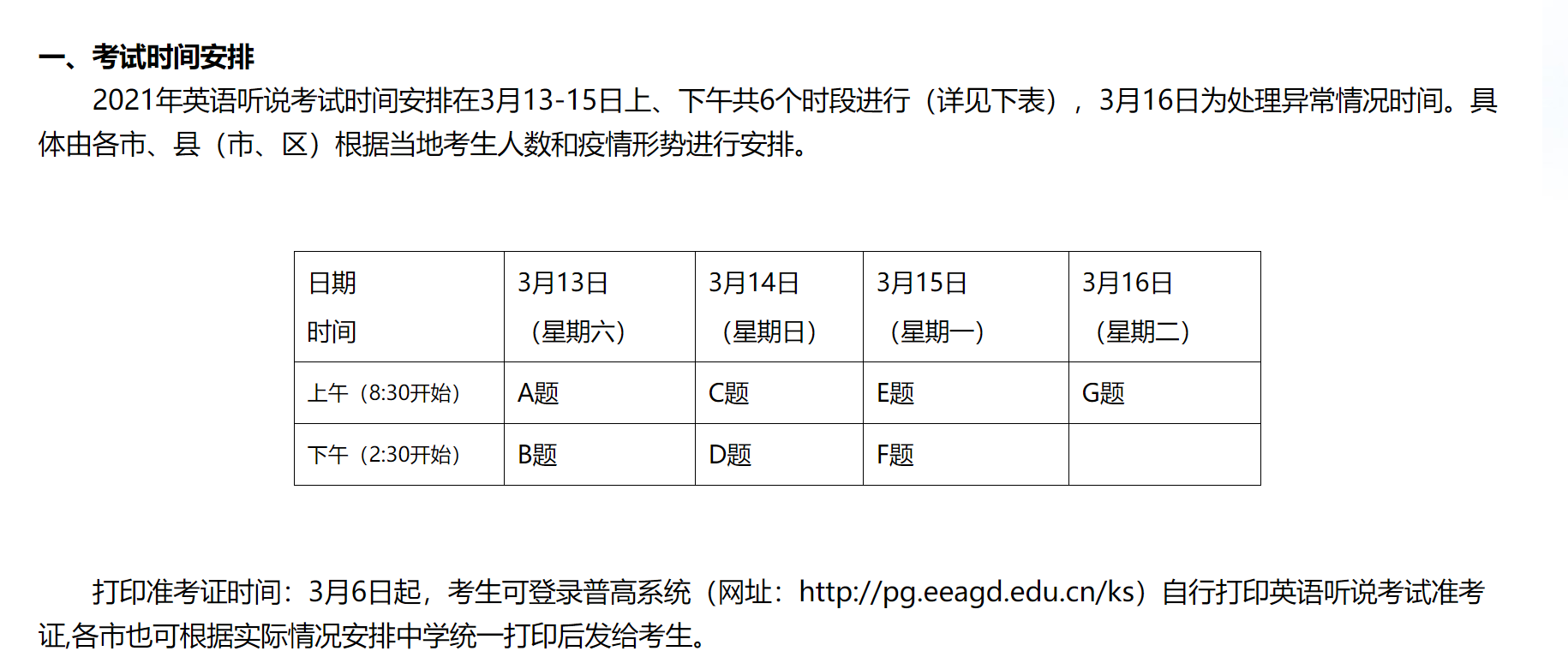 英语听说考试时间安排在3月13-15日上、下午共6个时段进行。3月13日(星期六)将进行A题、B题的听力考试、3月14日(星期日)将进行C题、D题的考试。3月15日(星期一)将进行E题、F题的考试,3月16日(星期二)将进行G题的考试。