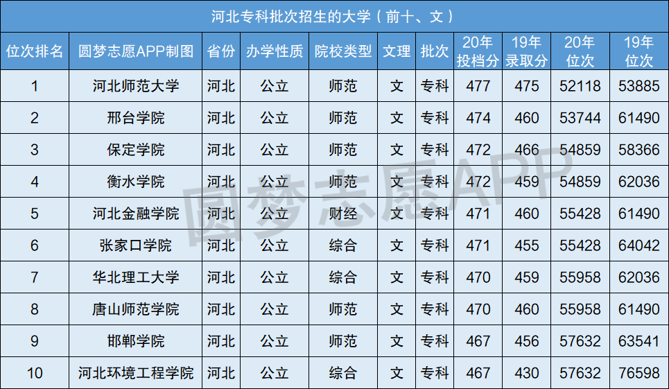 河北省专科批次招生大学2020年最好位次排名前十(文)
