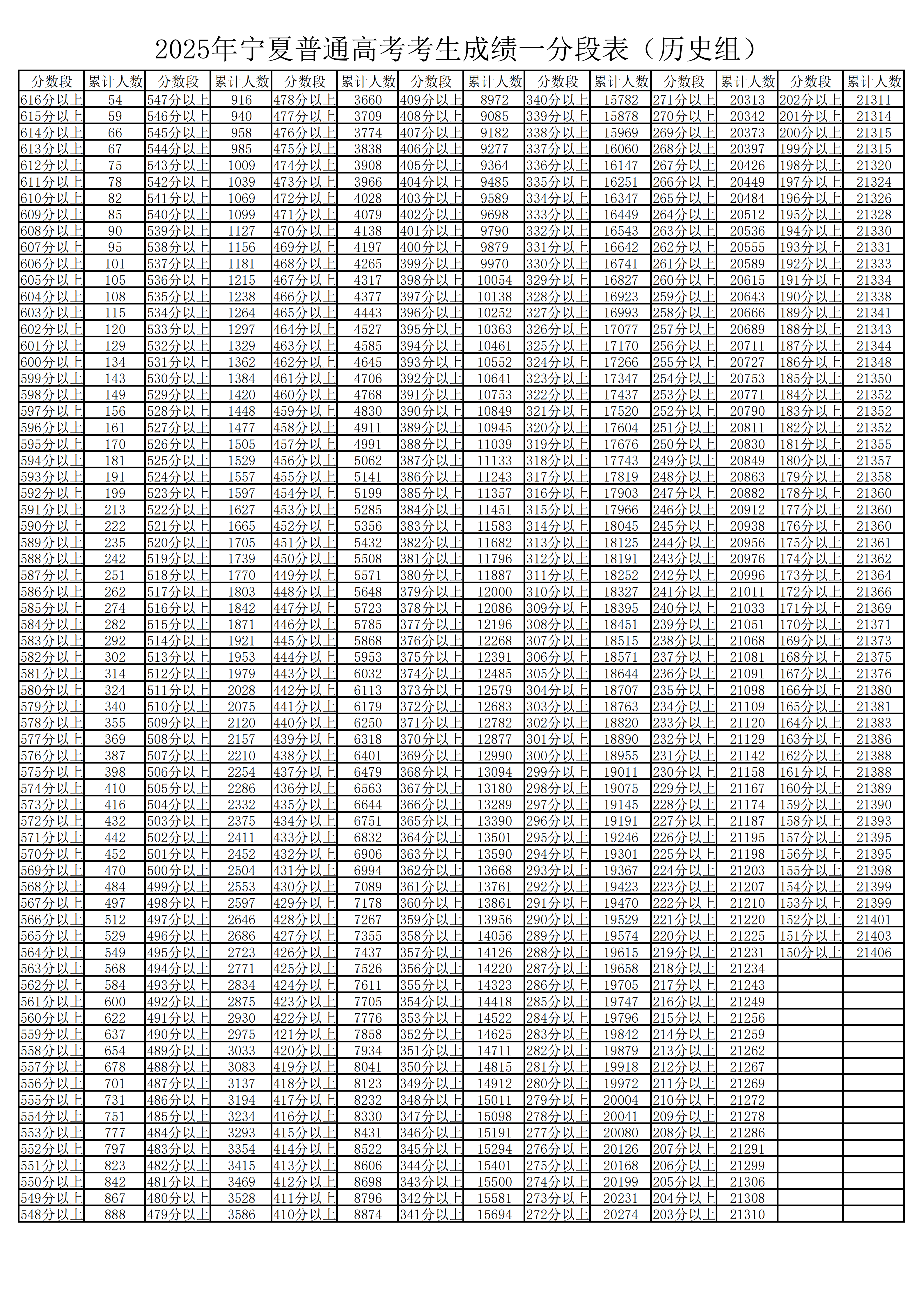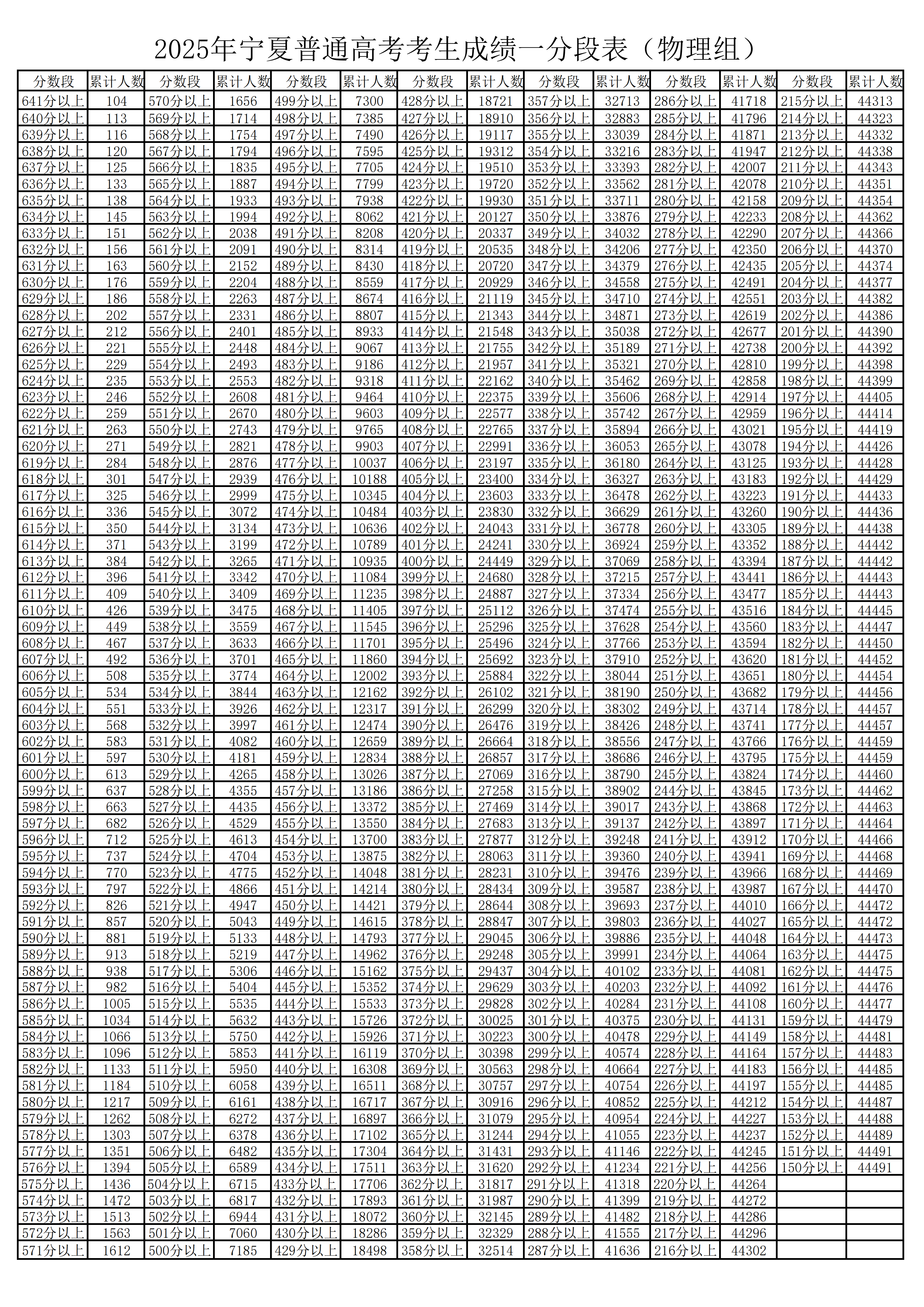 一、2025年宁夏高考一分一段表完整版