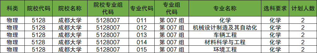 第007组:专业组代码为5128007,包含化学、机械设计制造及其自动化、车辆工程、材料科学与工程、环境工程。
