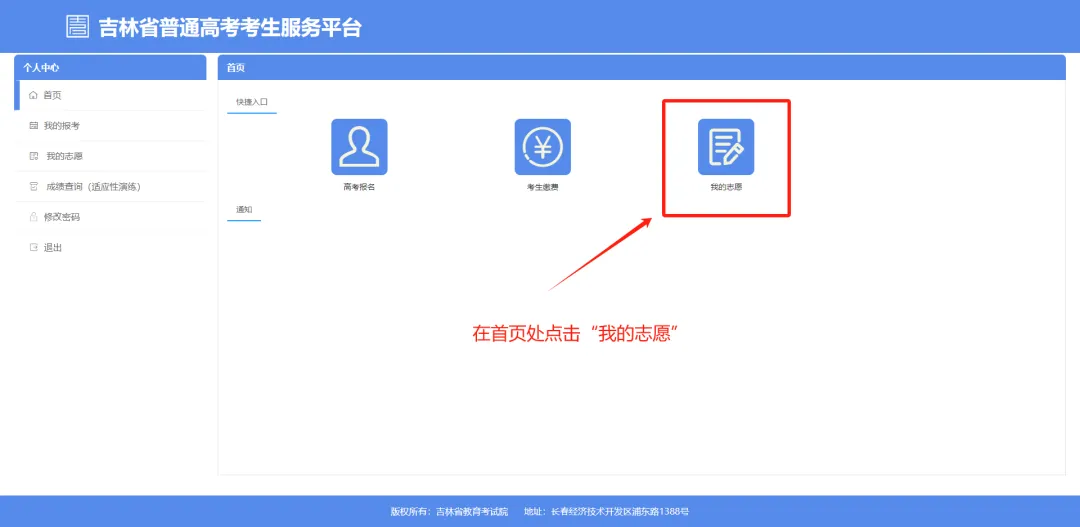 登录成功,在系统首页位置点击【我的志愿】跳转下一步,进行院校志愿填报操作。