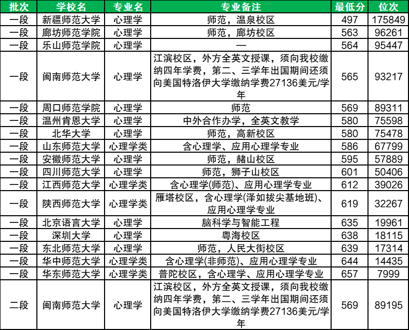 2025年心理学院校在浙江一段招生分数基本在560分以上,低于560分的只有新疆师范大学,学校2025年心理学专业最低录取分数为497分,专业方向是师范方向。
