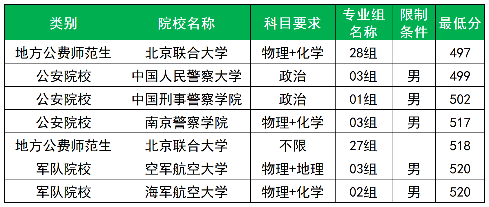 500分左右大学:中国人民警察大学(03组499分)、中国刑事警察学院(01组502分)、南京警察学院(03组517分)