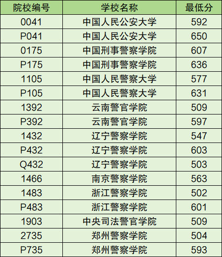 中国人民公安大学607分、中国人民警察大学458分、南京警察学院5478分、中国刑事警察学院578分、郑州警察学院497分、辽宁警察学院504、云南警官学院498分、浙江警察学院476分。