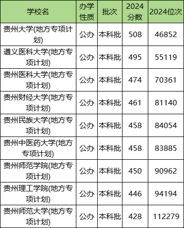以贵州物理类为例,2024年全国地方专项计划大学录取分数线位于428分到508分之间,最难考的是贵州大学(地方专项计划),学校2024年最低是508分,录取最低位次46852名。
