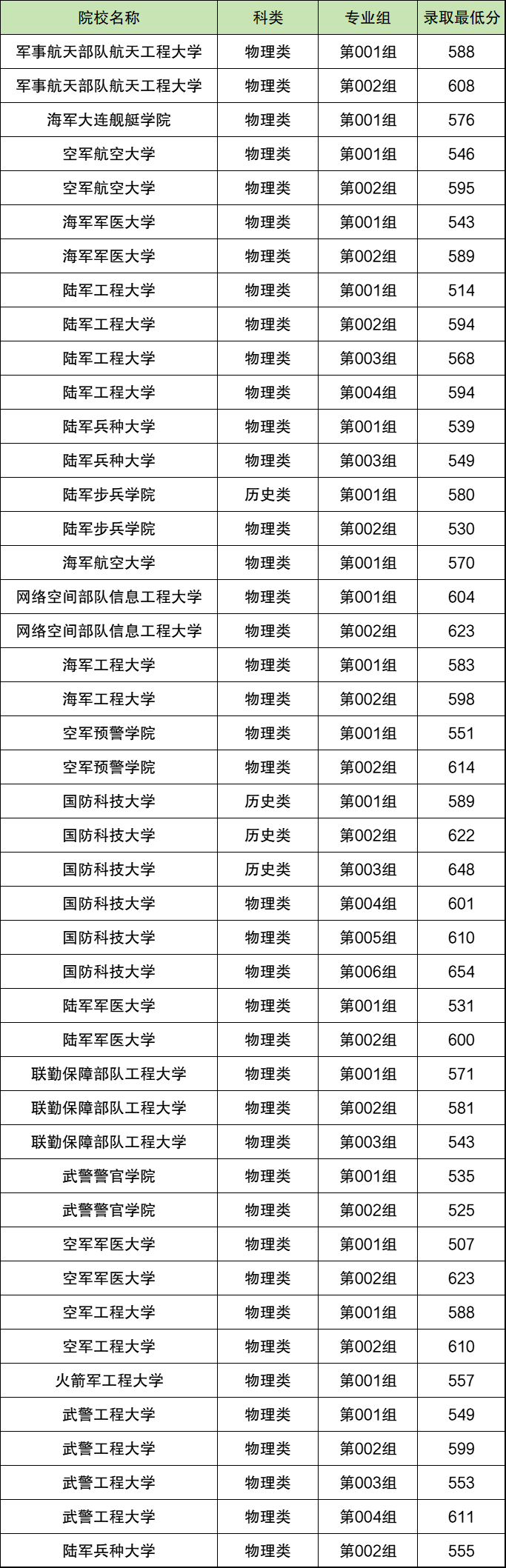 2025年黑龙江共有19所军校招生,分科类的最低分为:历史类580分、物理类507分,分别对应陆军步兵学院第001组和空军军医大学第001组。