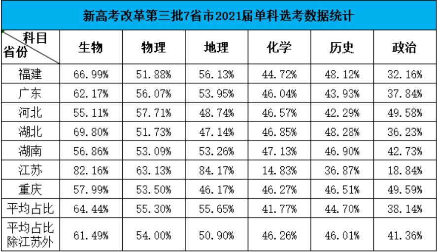 从上述数据可以了解到,湖南省的考生有53.7万,因此该省本次参考的考生人数大致也会在50万人左右,此外小编收集了本次联考选考各个科目人数的比例分析表,从下表中可以了解到湖南省首选科目中,选择物理的考生比较多,再选科目中选择生物、地理的考生占比较大。