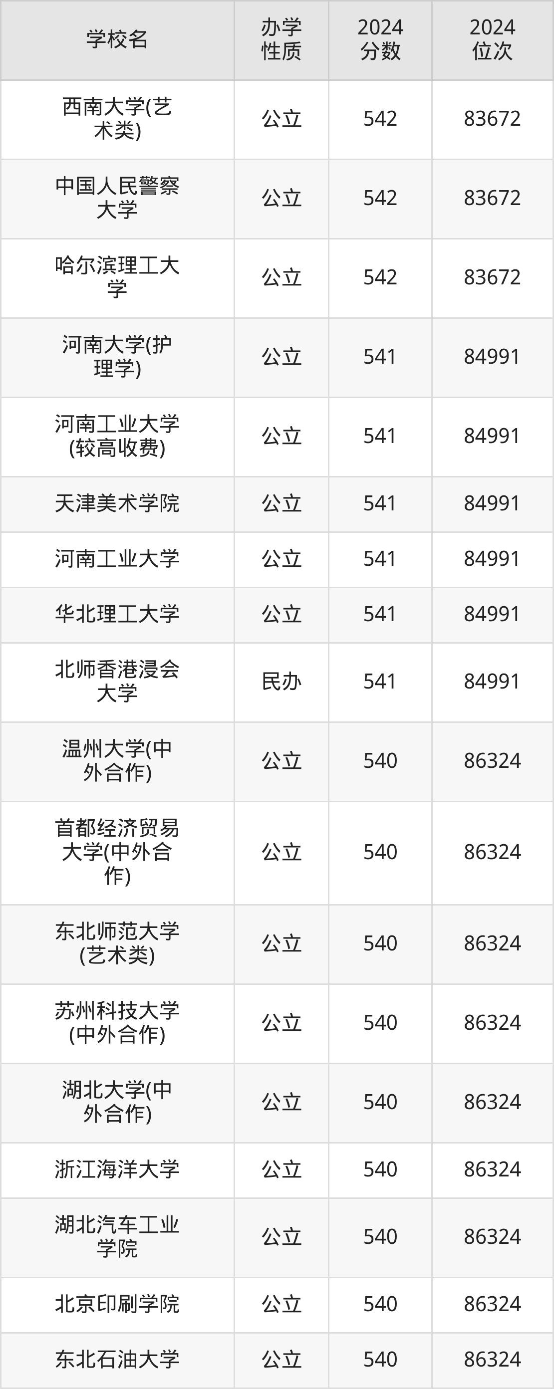 | 河南工业大学 (较高收费) | 541 | 84991 |