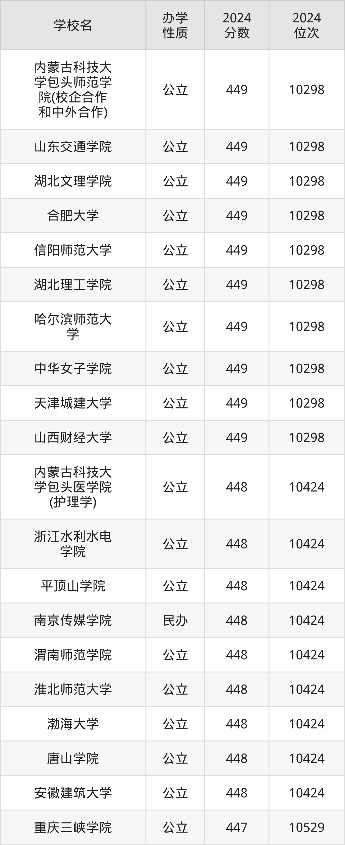 | 内蒙古科技大 学包头师范学 院(校企合作 和中外合作) | 449 | 10298 |