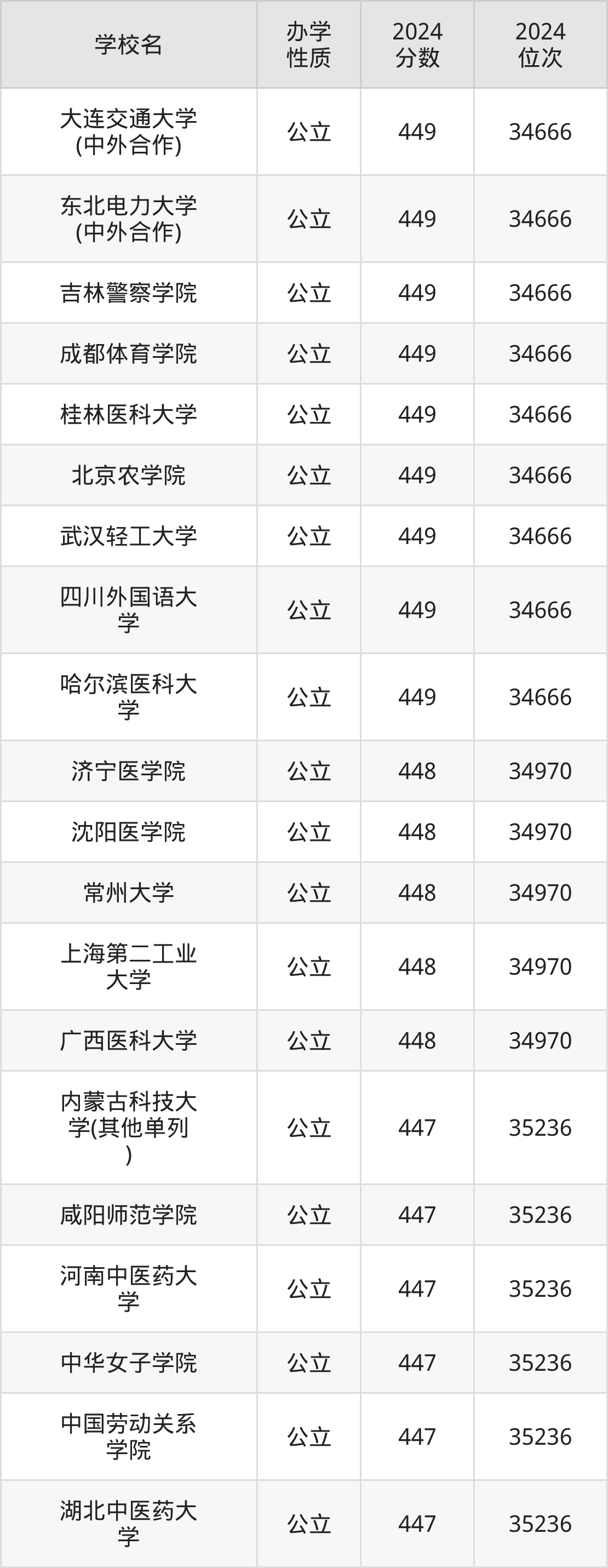 2024年内蒙古理科444分考生能上大连交通大学(中外合作)、东北电力大学(中外合作)、吉林警察学院、成都体育学院、桂林医科大学等35所二本院校,具体录取分数线及位次为: