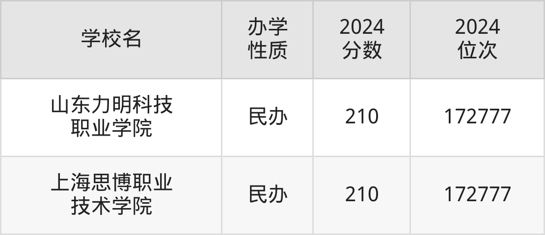 | 山东力明科技 职业学院 | 210 | 172777 |