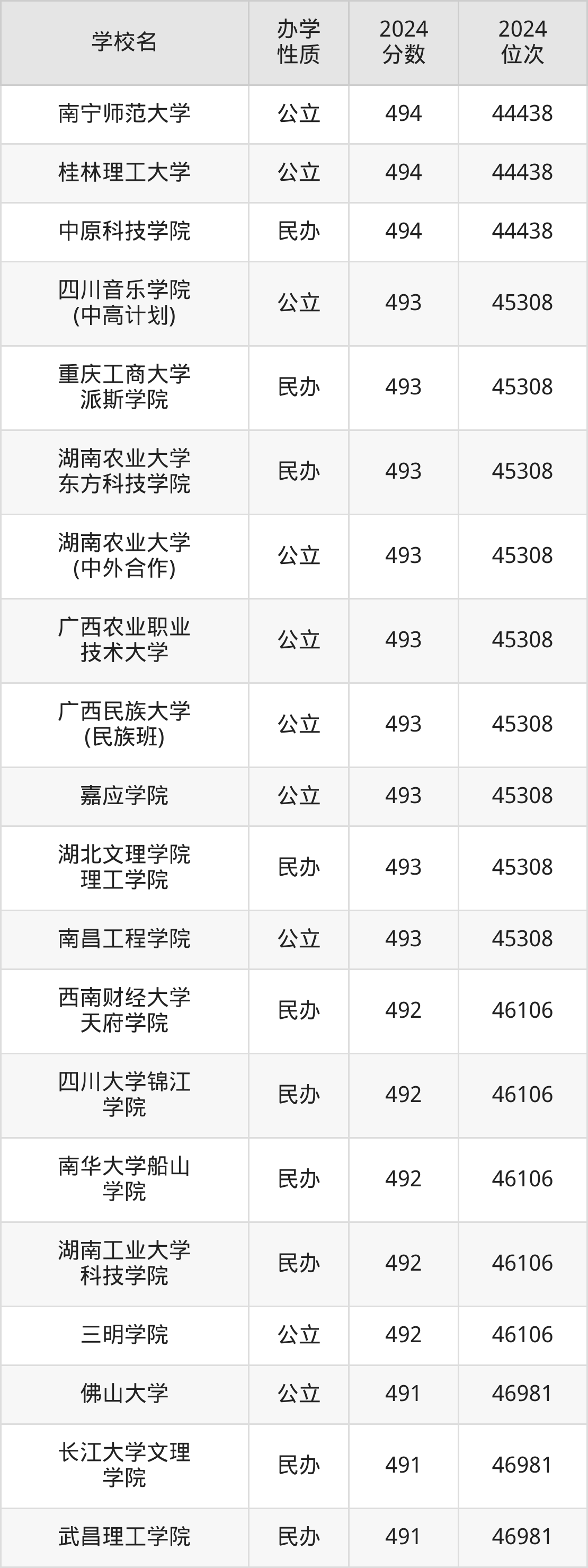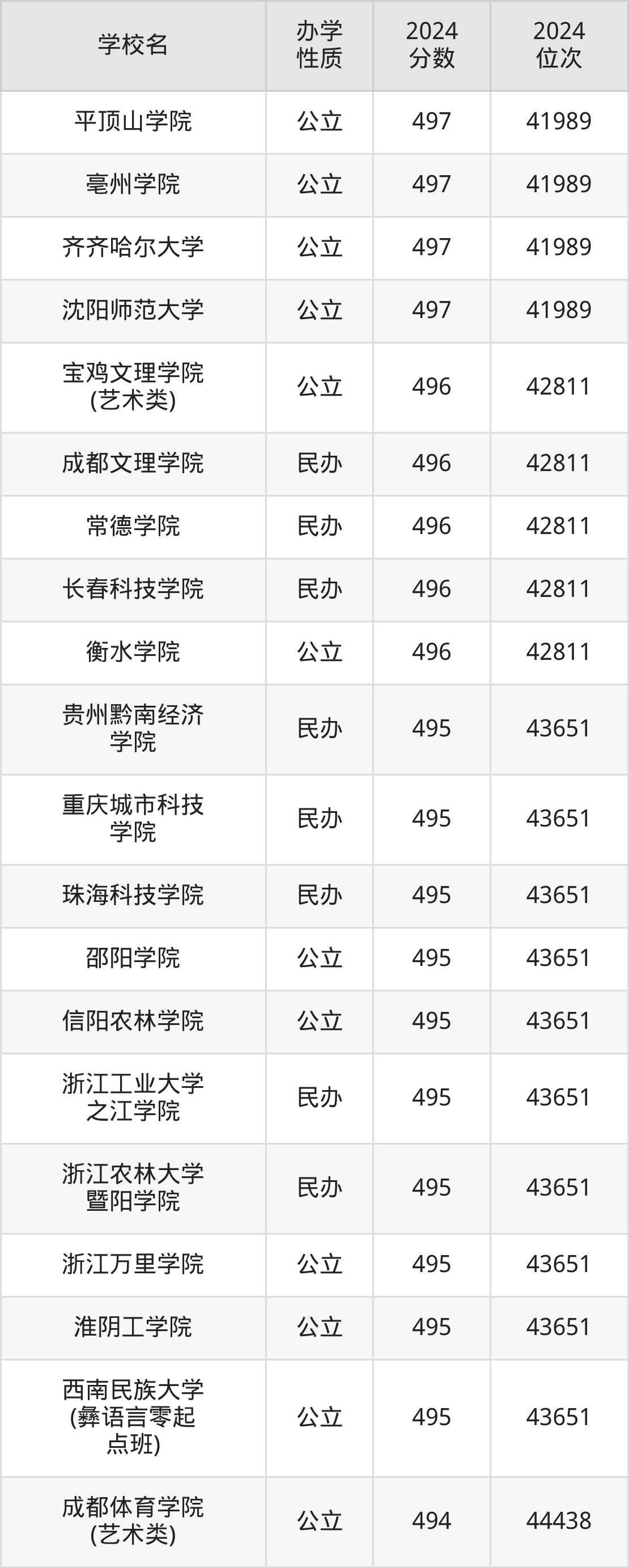 | 成都体育学院 (艺术类) | 494 | 44438 |