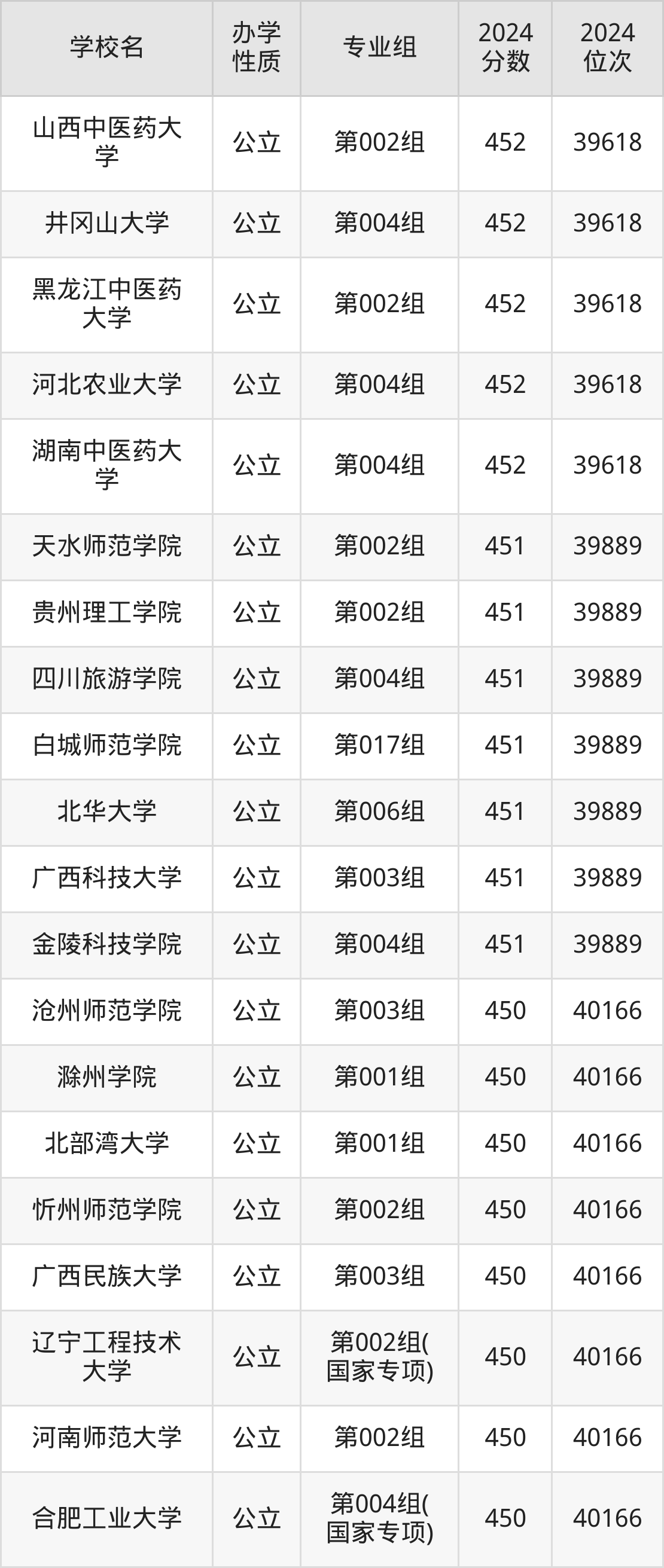 | 长春中医药大 学 | 第011组( 地方专项) | 452 | 39618 |