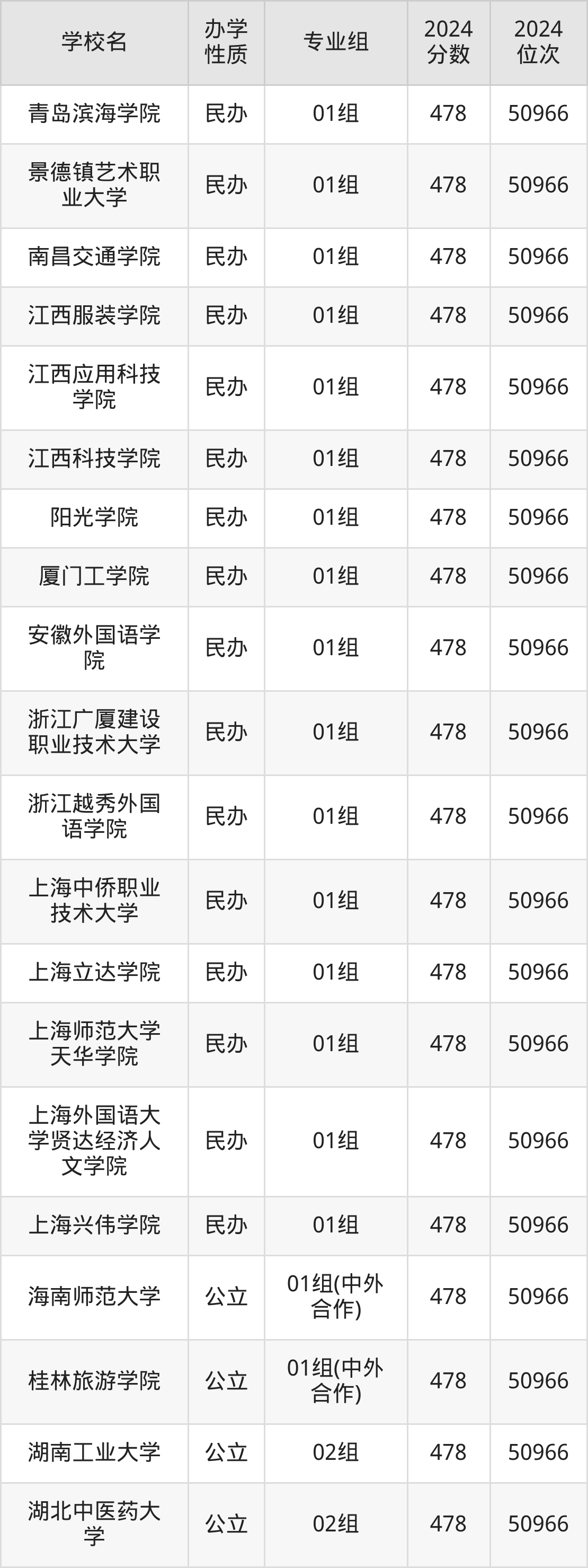 | 海南热带海洋 学院 | 01组(中外 合作) | 482 | 49204 |