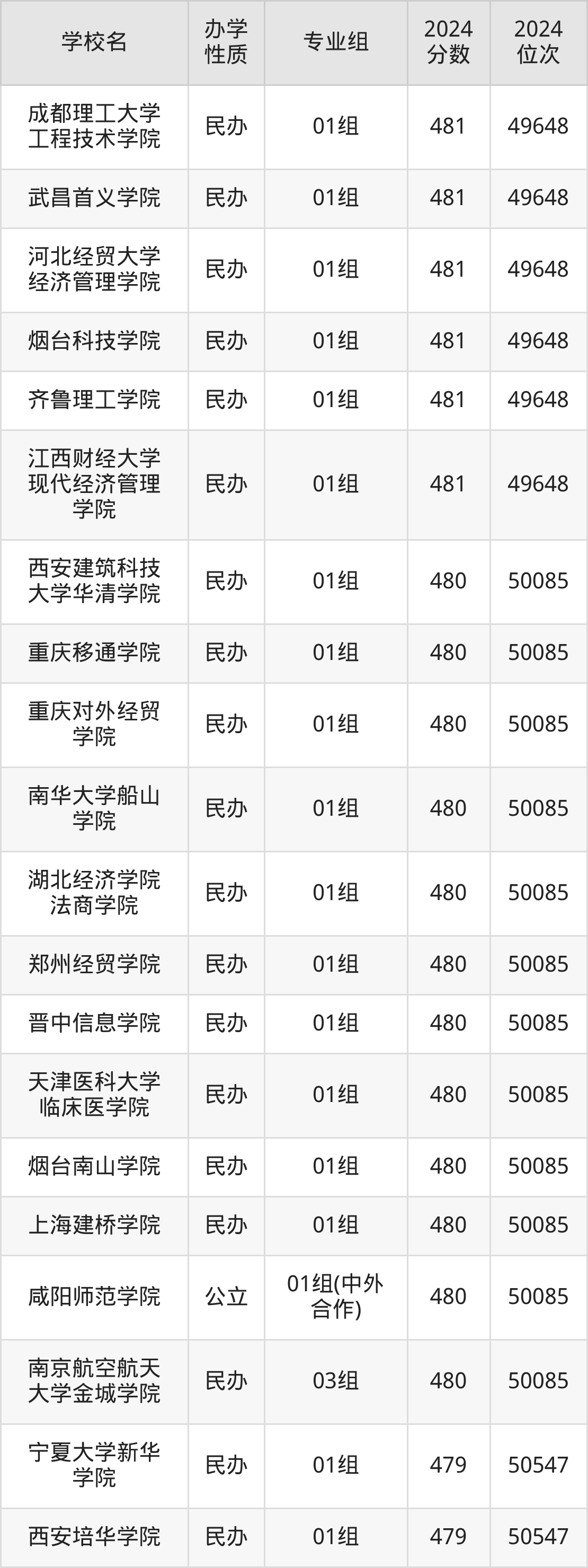 | 重庆移通学院 | 01组 | 480 | 50085 |