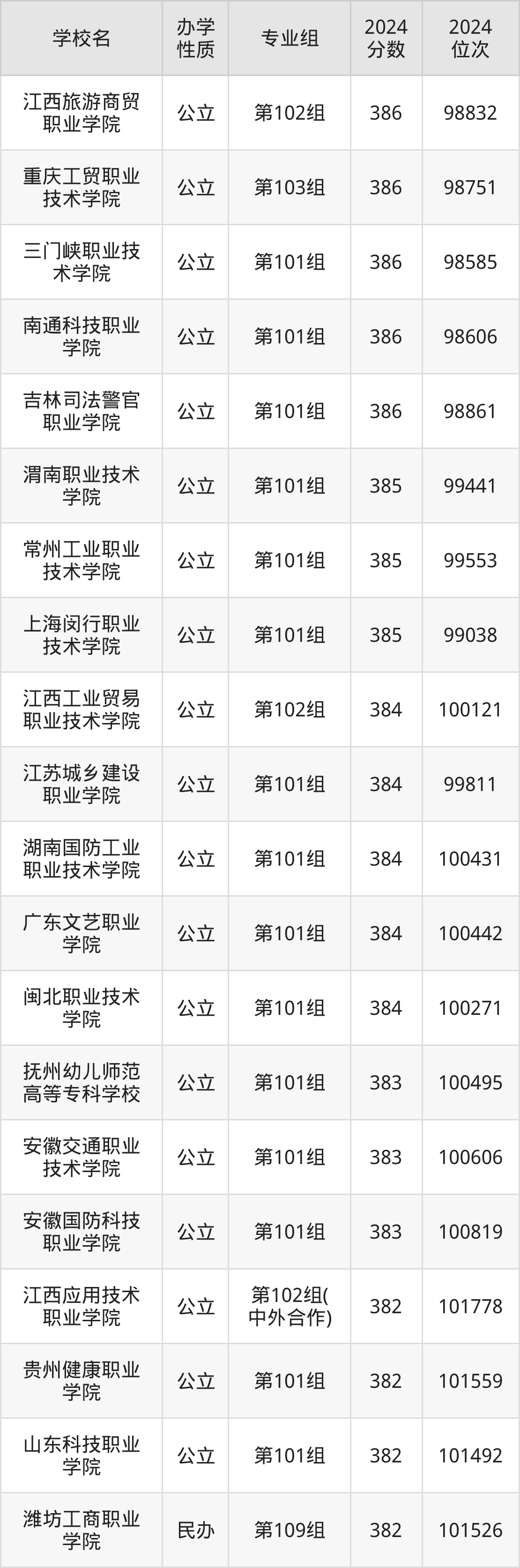 | 吉林司法警官 职业学院 | 第101组 | 386 | 98861 |