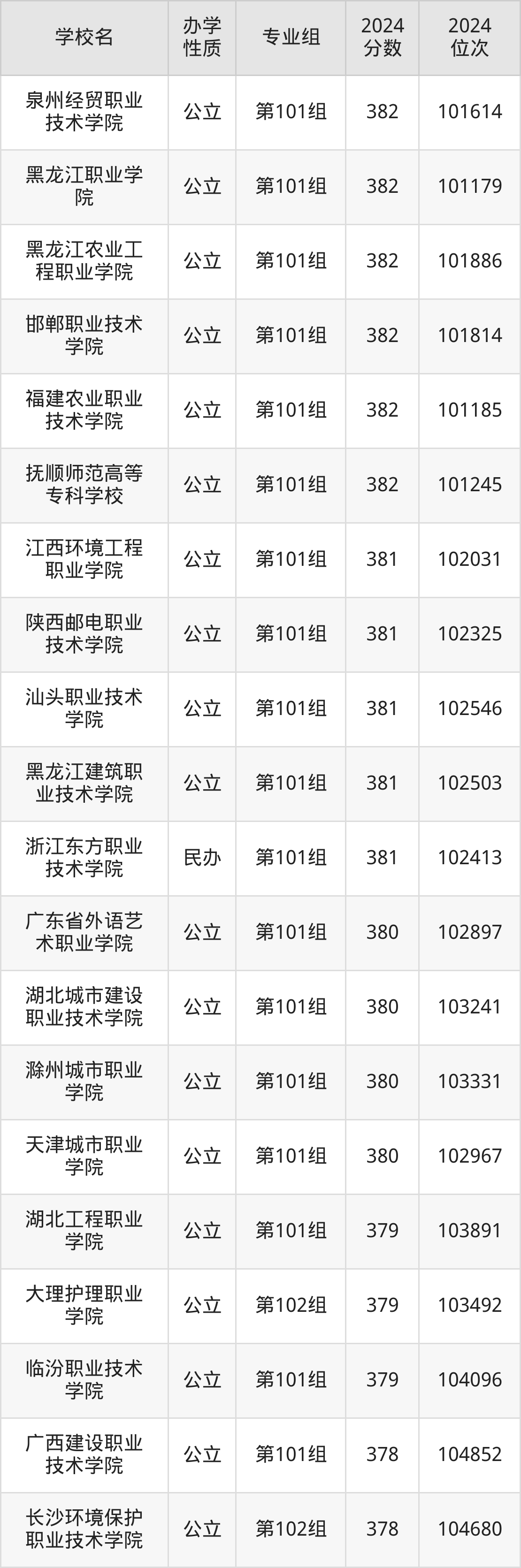 | 湖北城市建设 职业技术学院 | 第101组 | 380 | 103241 |