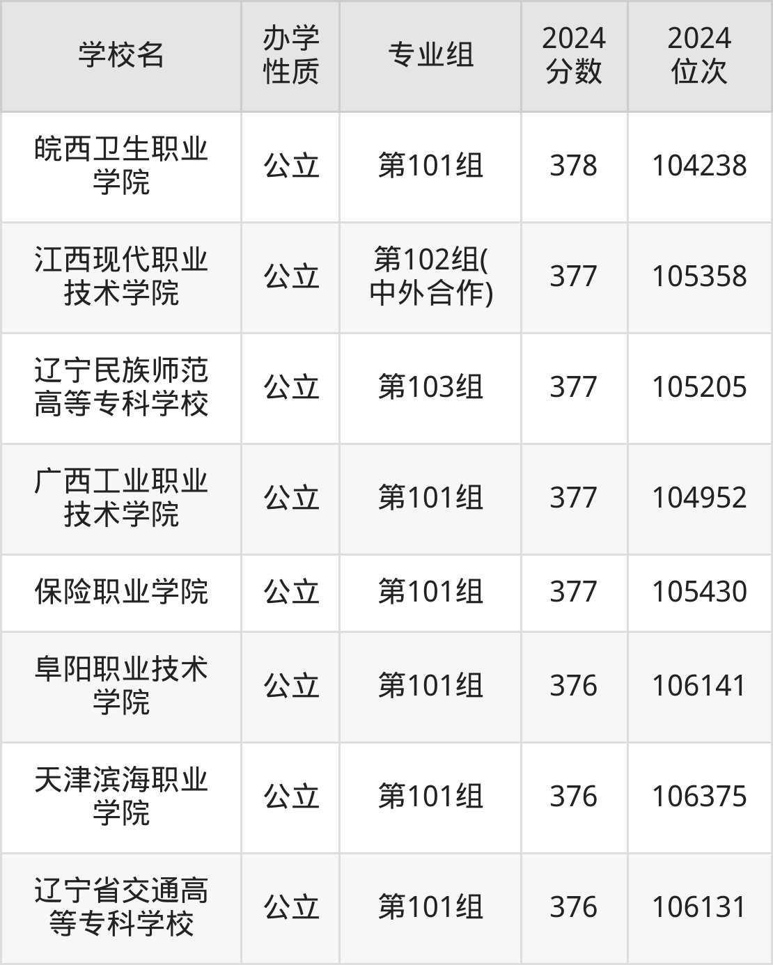 | 辽宁省交通高 等专科学校 | 第101组 | 376 | 106131 |