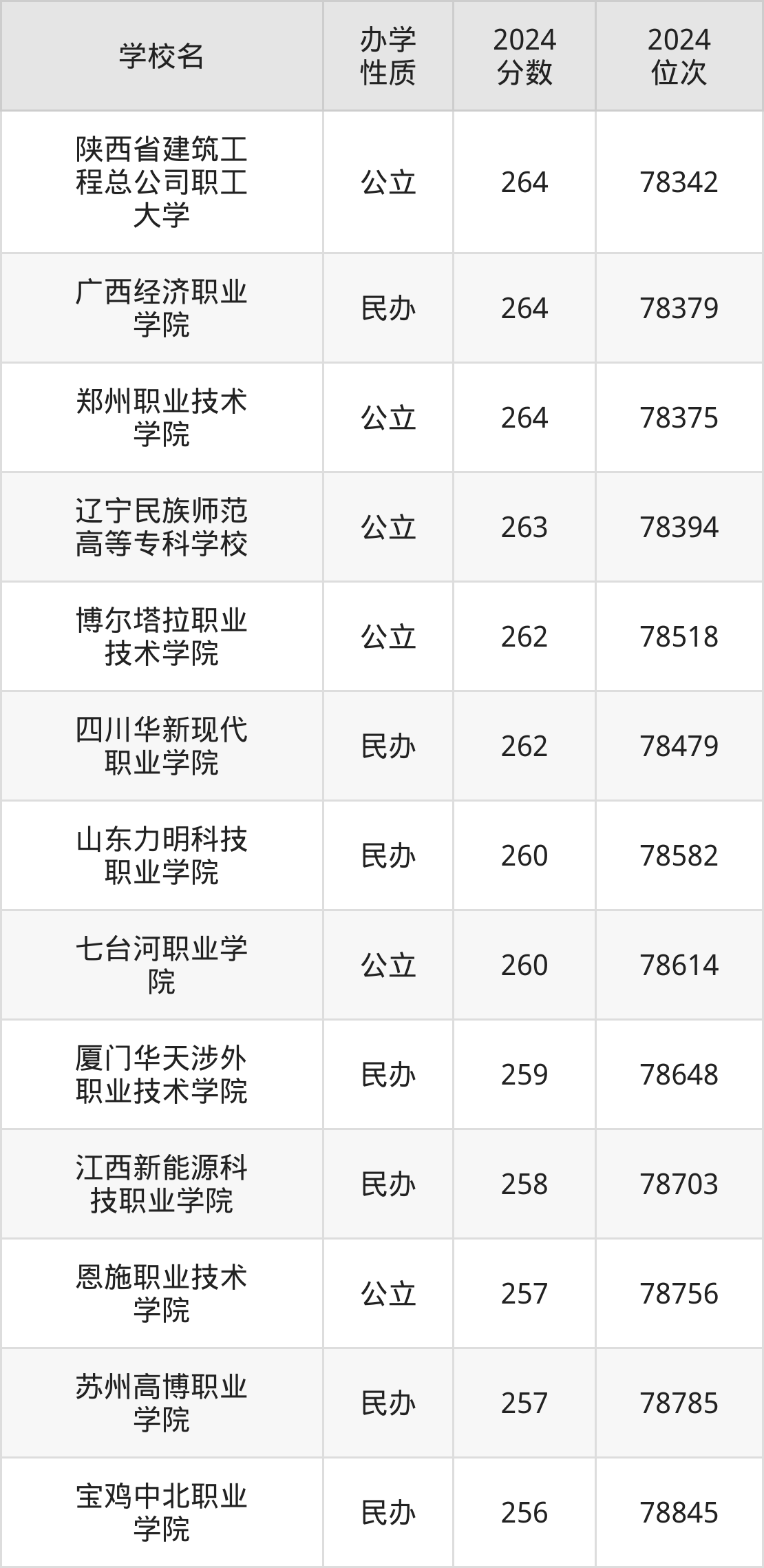 2024年陕西文科260分考生能上陕西省建筑工程总公司职工大学、广西经济职业学院、郑州职业技术学院、辽宁民族师范高等专科学校、博尔塔拉职业技术学院等13所专科院校,具体录取分数线及位次为: