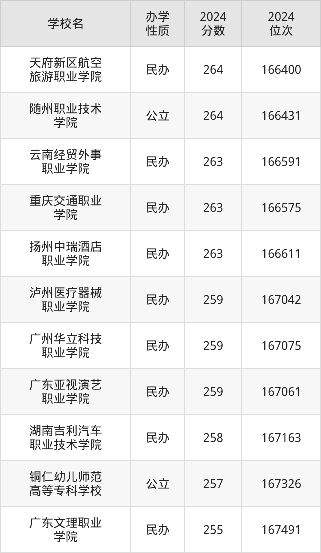 2024年陕西理科260分考生能上天府新区航空旅游职业学院、随州职业技术学院、云南经贸外事职业学院、重庆交通职业学院、扬州中瑞酒店职业学院等11所专科院校,具体录取分数线及位次为: