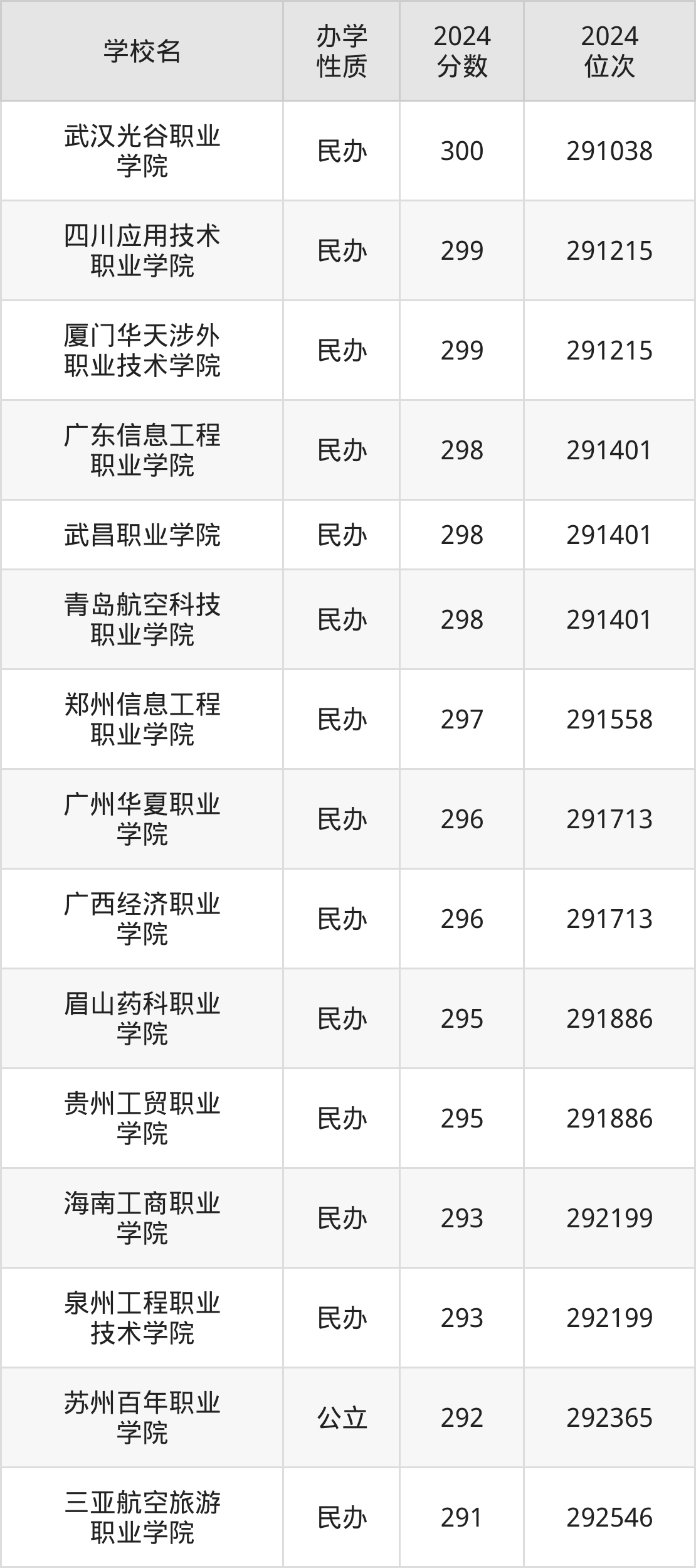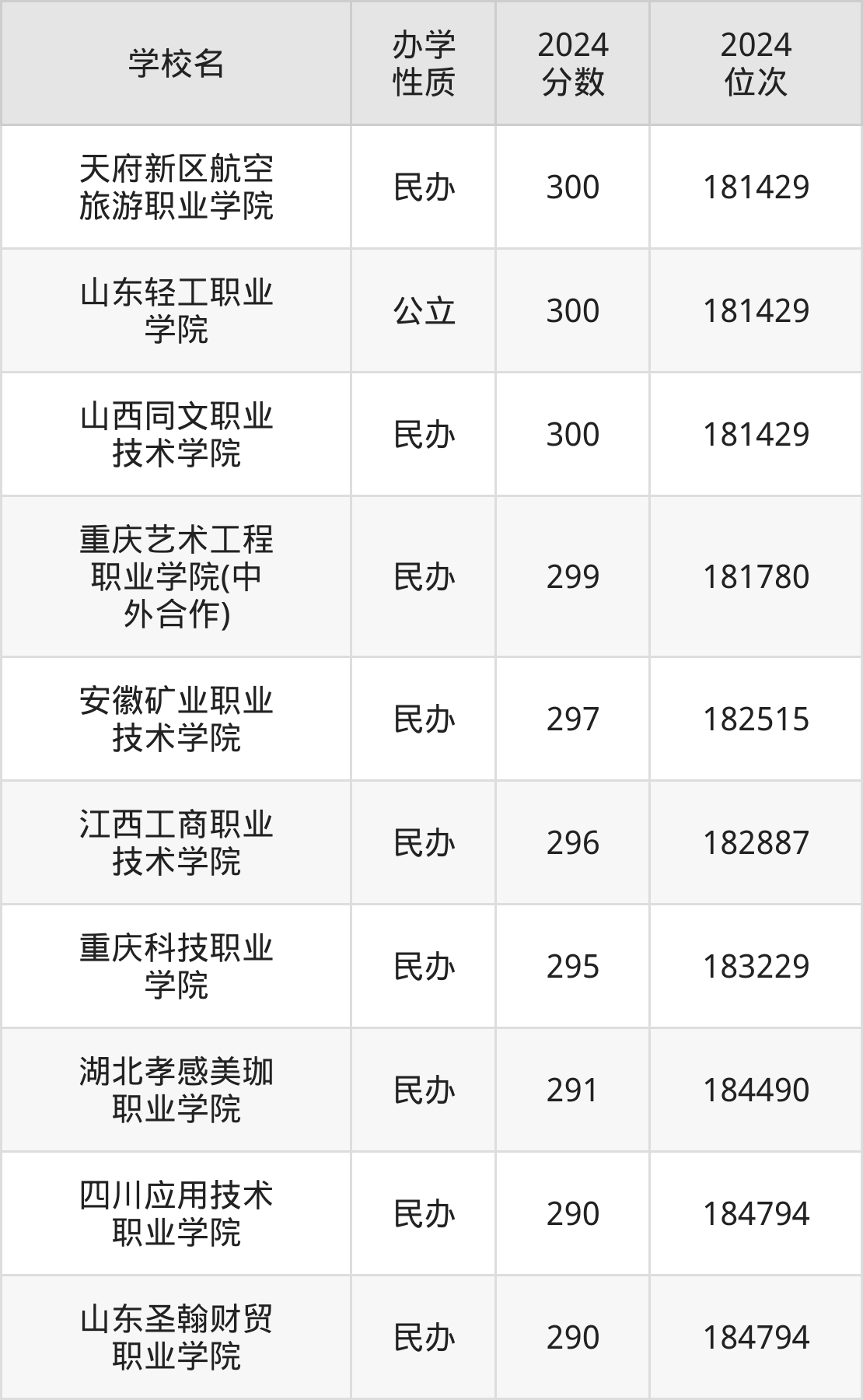 2024年四川文科295分考生能上天府新区航空旅游职业学院、山东轻工职业学院、山西同文职业技术学院、重庆艺术工程职业学院(中外合作)、安徽矿业职业技术学院等10所专科院校,具体录取分数线及位次为: