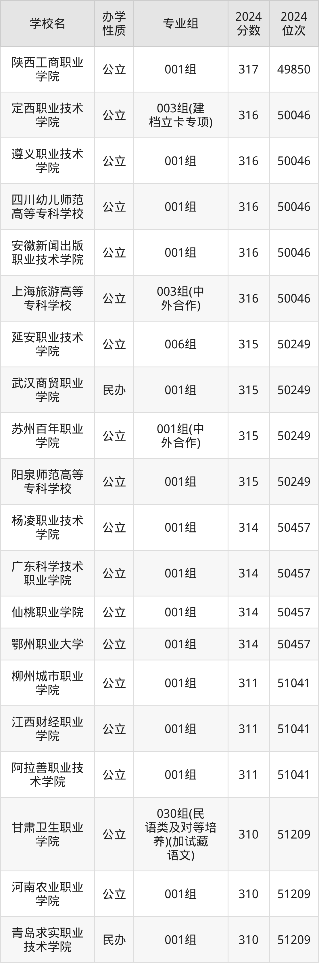| 上海旅游高等 专科学校 | 003组(中 外合作) | 316 | 50046 |