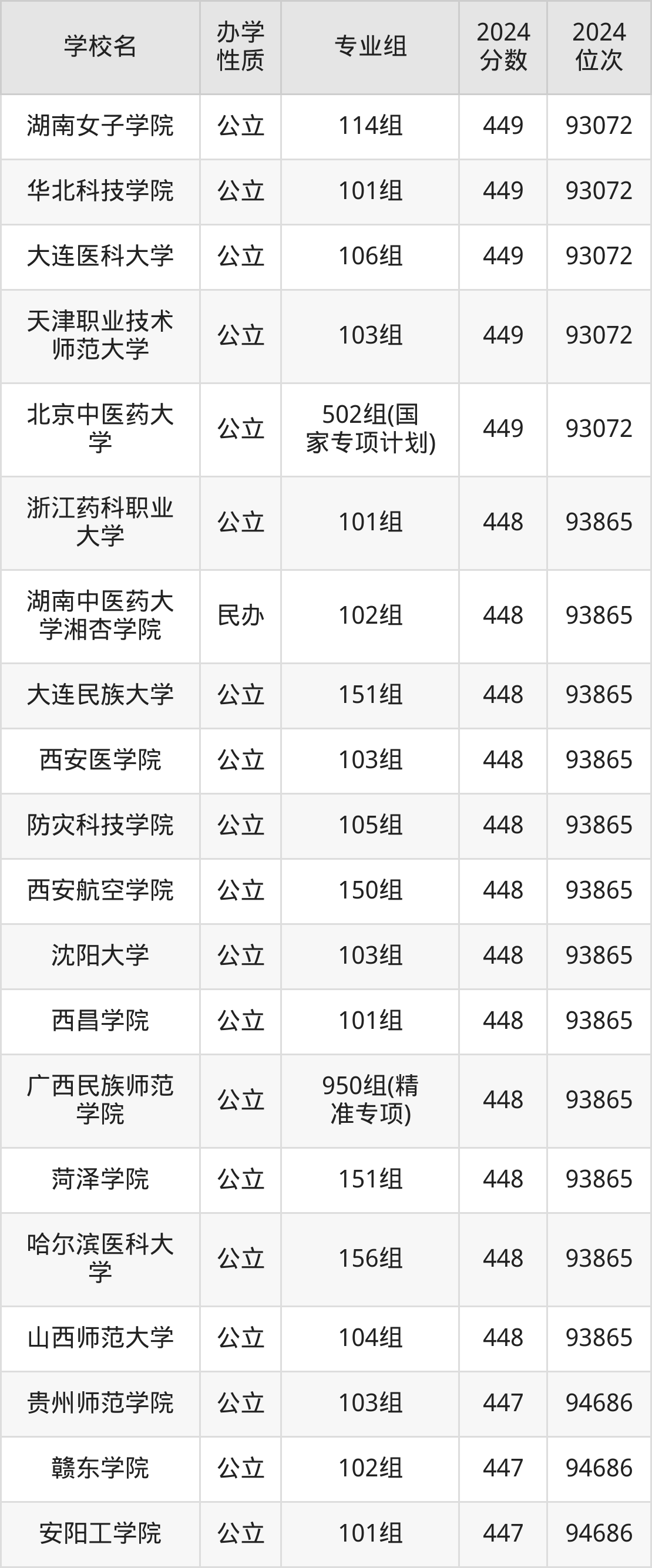 | 北京中医药大 学 | 502组(国 家专项计划) | 449 | 93072 |