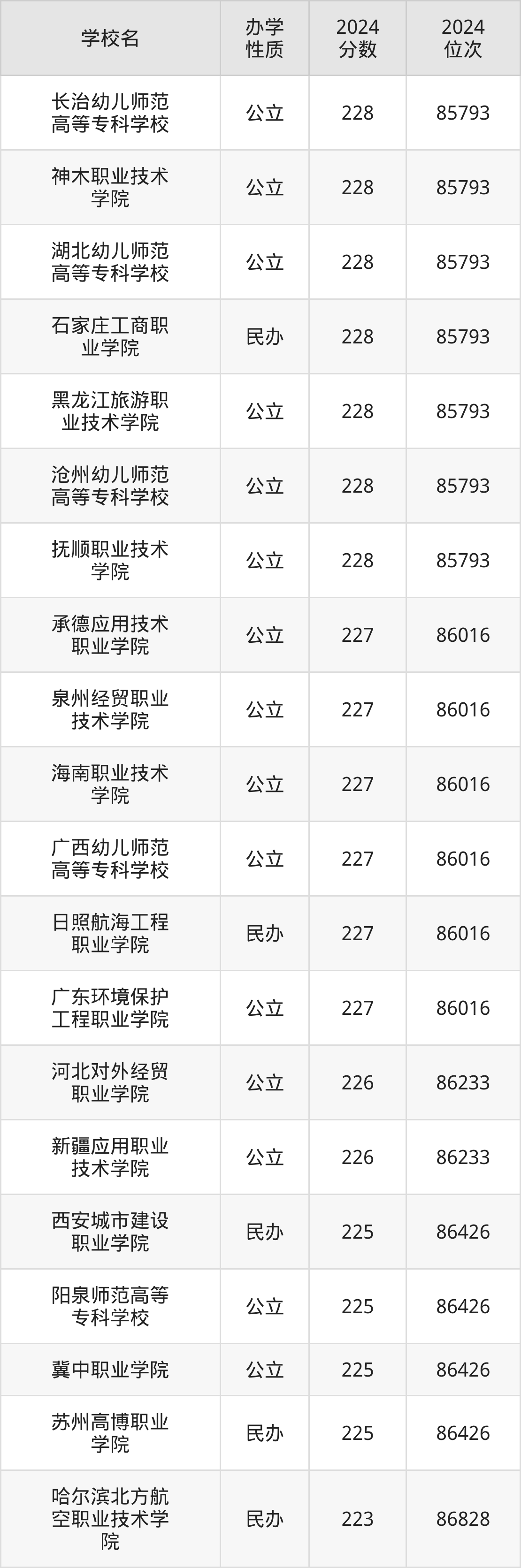 | 长治幼儿师范 高等专科学校 | 228 | 85793 |
