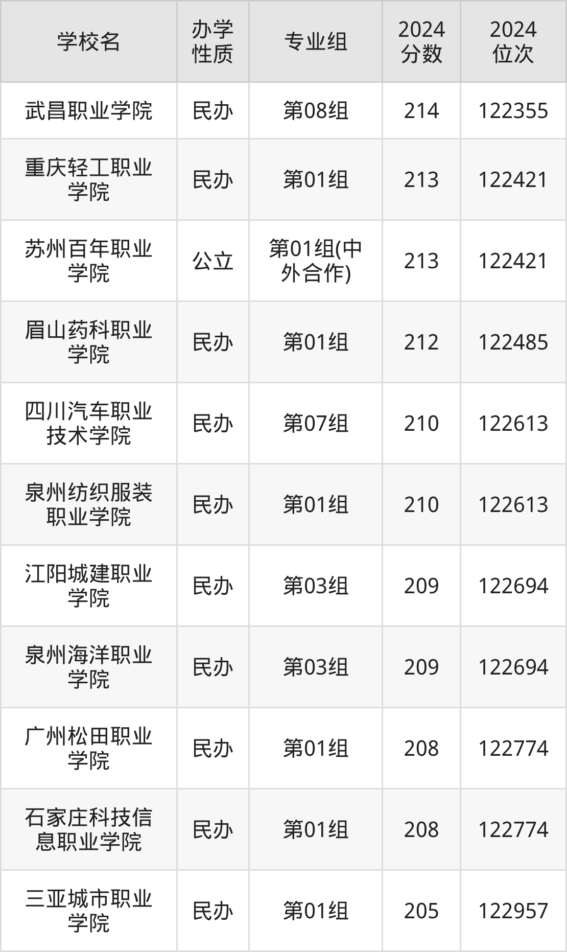 2024年湖北历史类210分考生能上武昌职业学院、重庆轻工职业学院、苏州百年职业学院、眉山药科职业学院、四川汽车职业技术学院等11所专科院校,具体录取分数线及位次为: