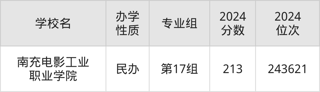 | 南充电影工业 职业学院 | 第17组 | 213 | 243621 |
