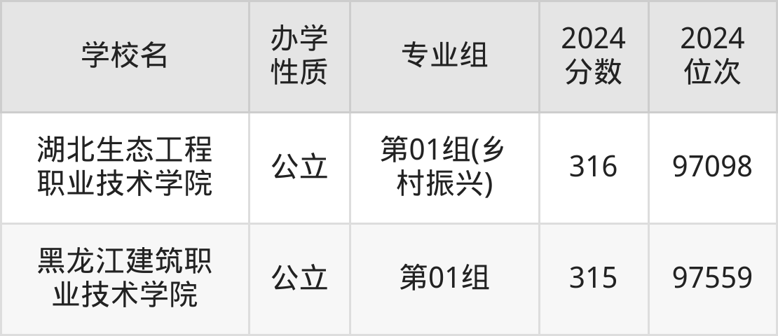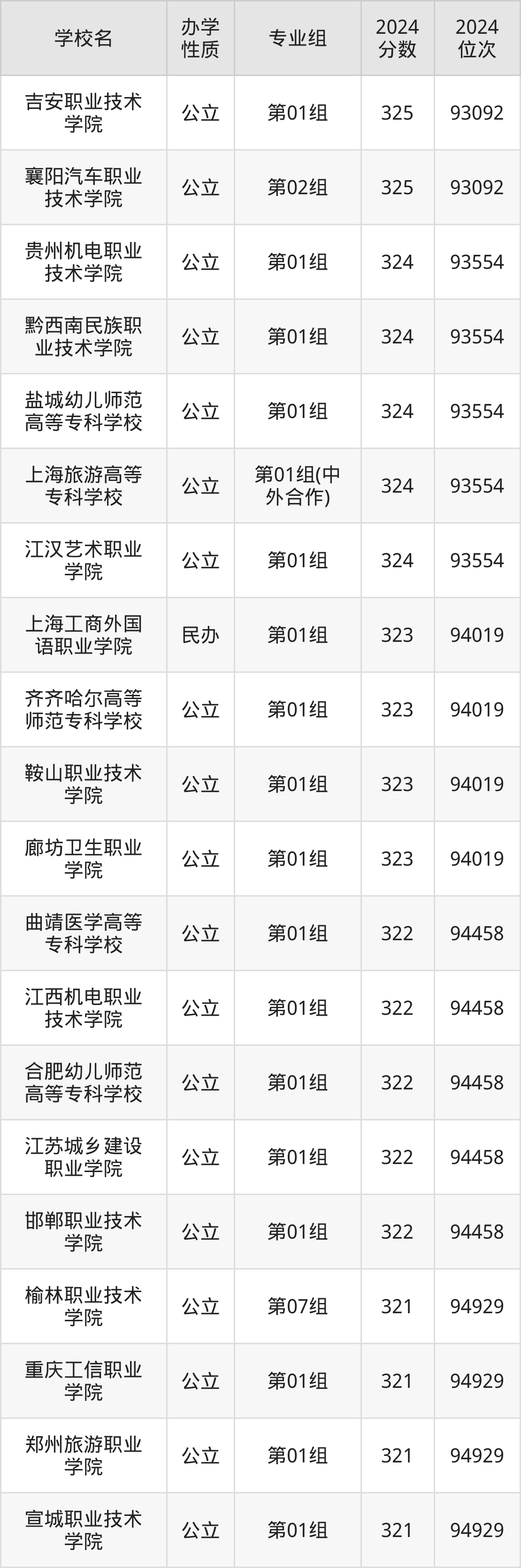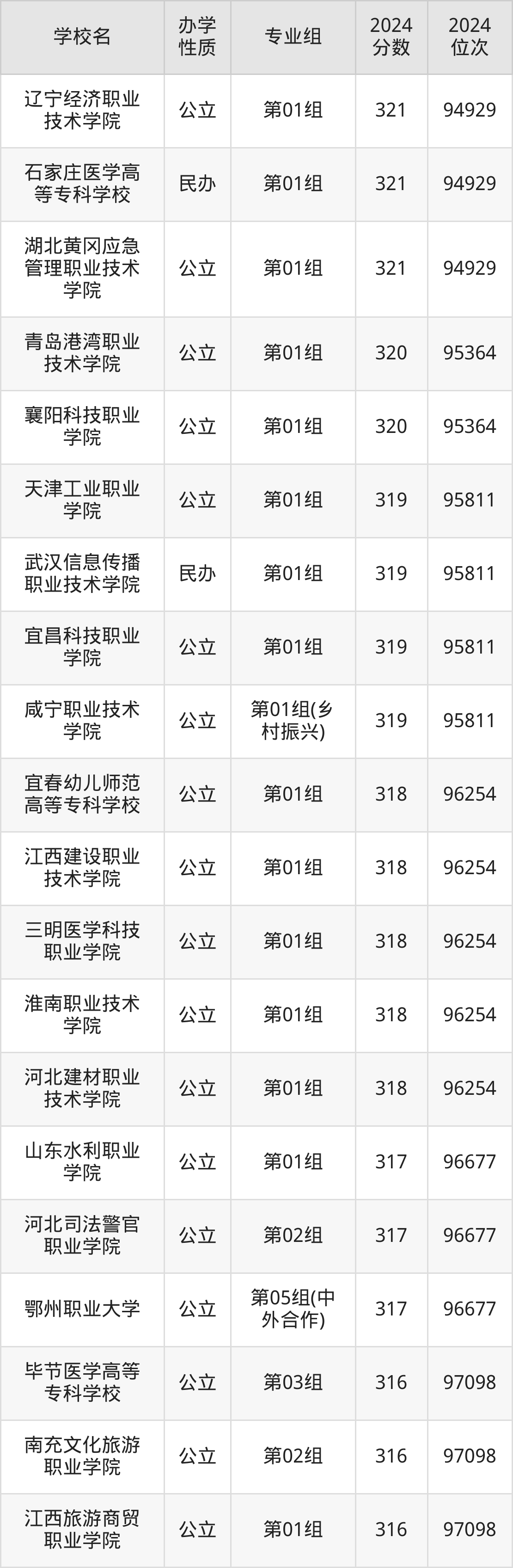 2024年湖北历史类320分考生能上吉安职业技术学院、襄阳汽车职业技术学院、贵州机电职业技术学院、黔西南民族职业技术学院、盐城幼儿师范高等专科学校等42所专科院校,具体录取分数线及位次为: