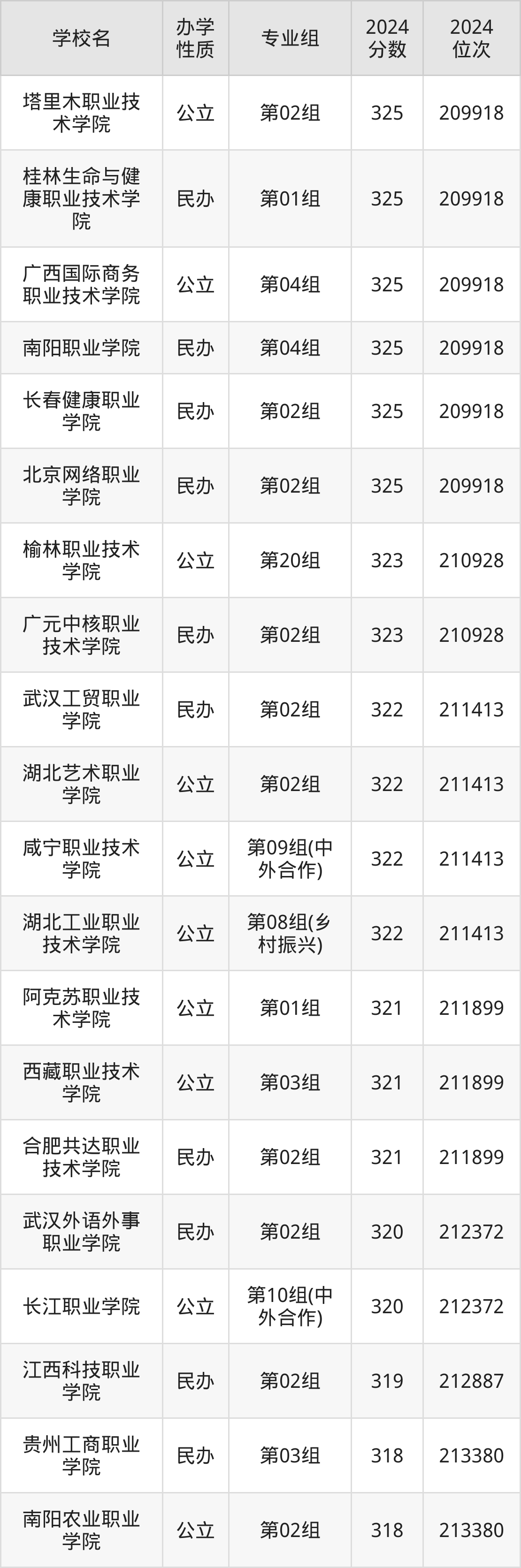 2024年湖北物理类320分考生能上塔里木职业技术学院、桂林生命与健康职业技术学院、广西国际商务职业技术学院、南阳职业学院、长春健康职业学院等30所专科院校,具体录取分数线及位次为:
