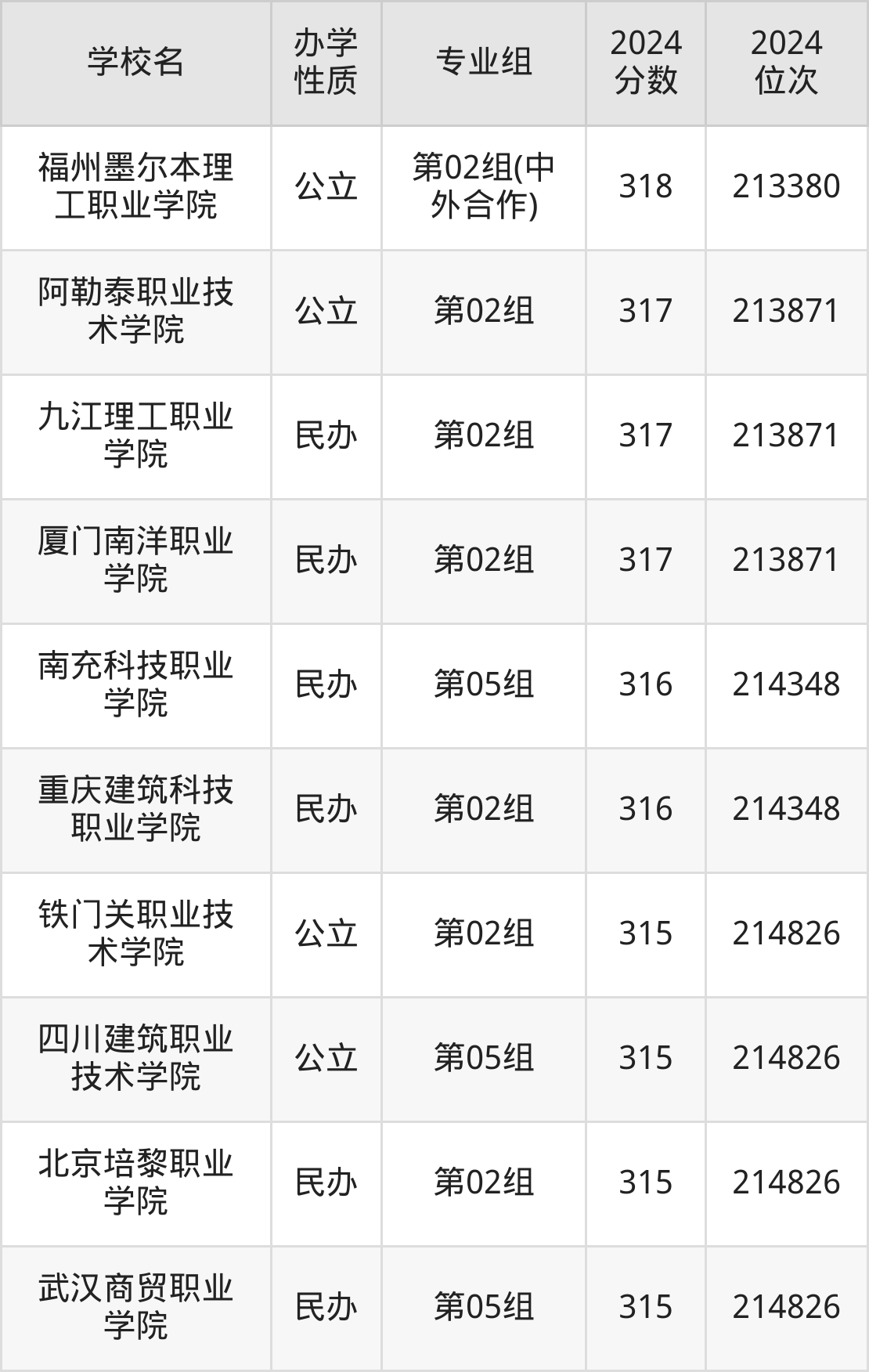| 福州墨尔本理 工职业学院 | 第02组(中 外合作) | 318 | 213380 |