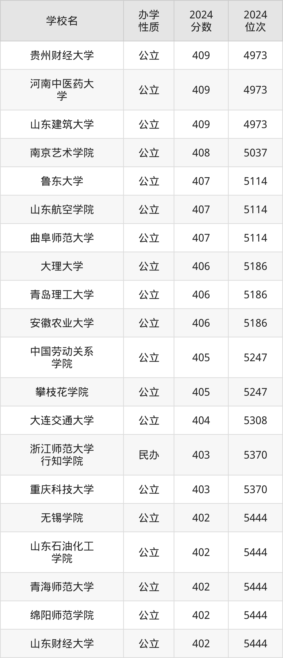 2024年新疆文科404分考生能上贵州财经大学、河南中医药大学、山东建筑大学、南京艺术学院、鲁东大学等29所二本院校,具体录取分数线及位次为: