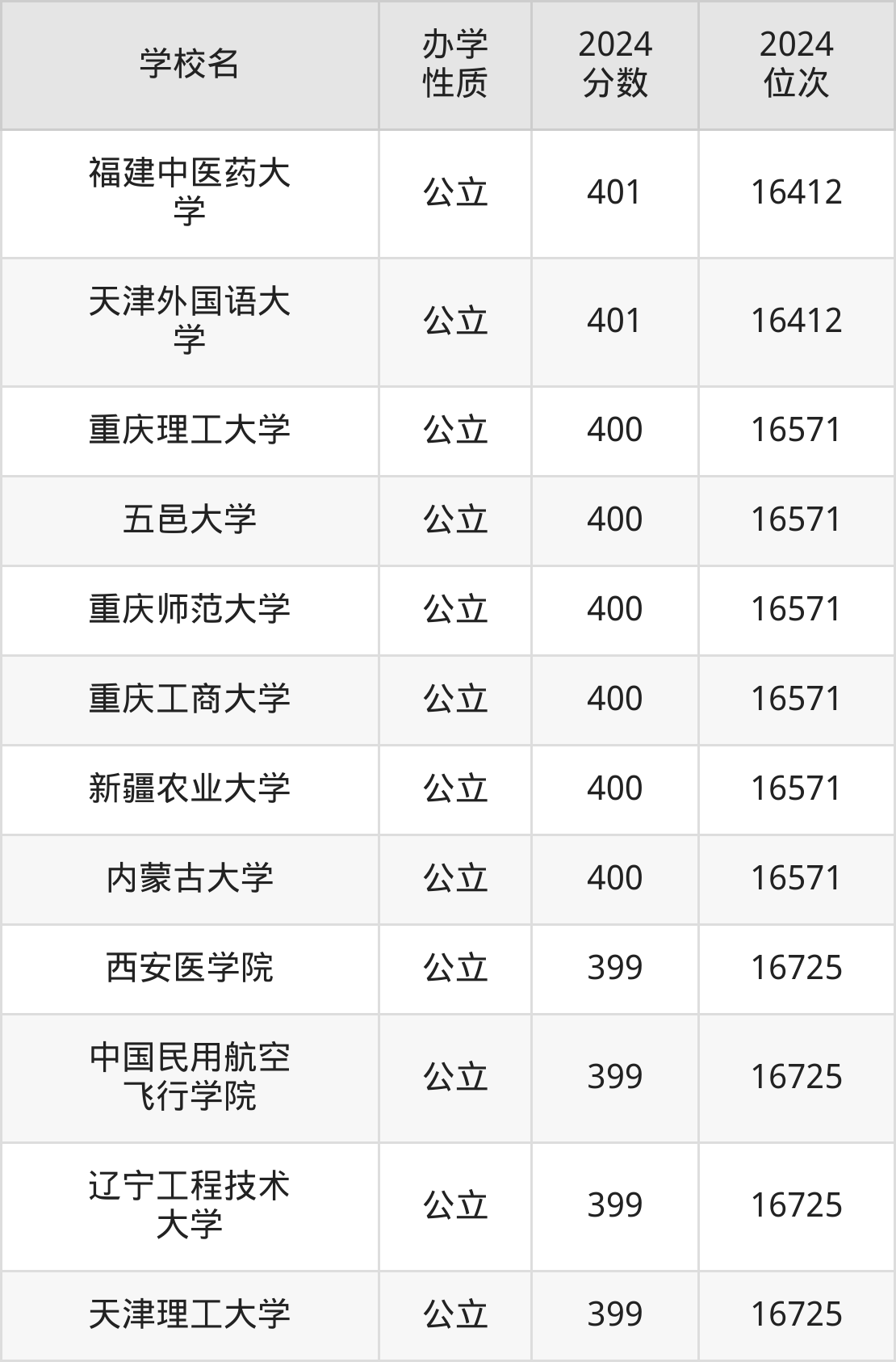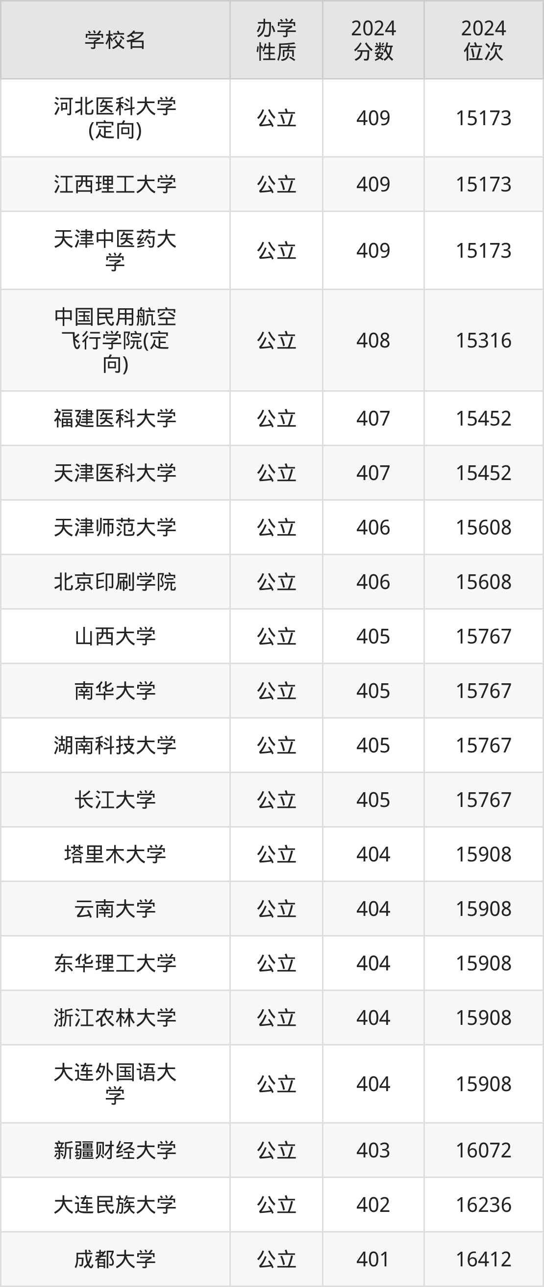 2024年新疆理科404分考生能上河北医科大学(定向)、中国民用航空飞行学院(定向)、山西大学、成都大学、福建中医药大学等10所二本院校,具体录取分数线及位次为: