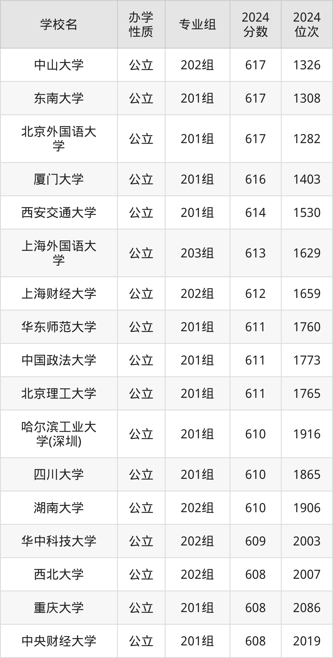 广东612分左右的考生可以上中山大学、东南大学、北京外国语大学等院校,刚好在612分的院校有上海财经大学。