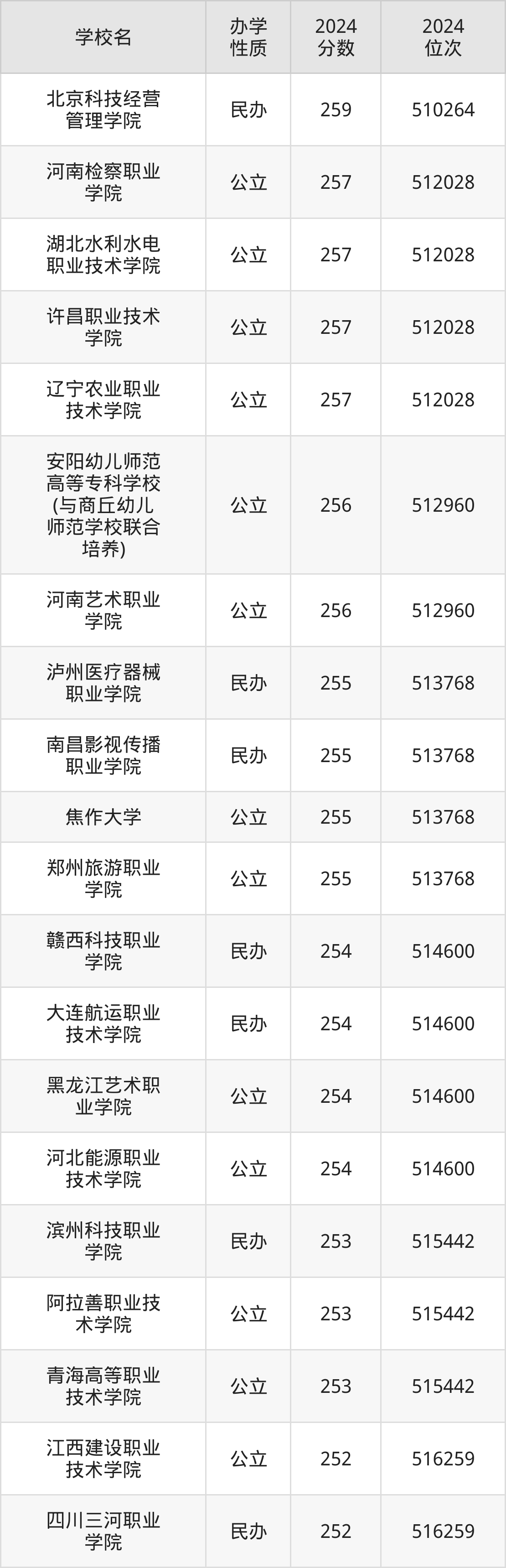 | 郑州旅游职业 学院 | 255 | 513768 |