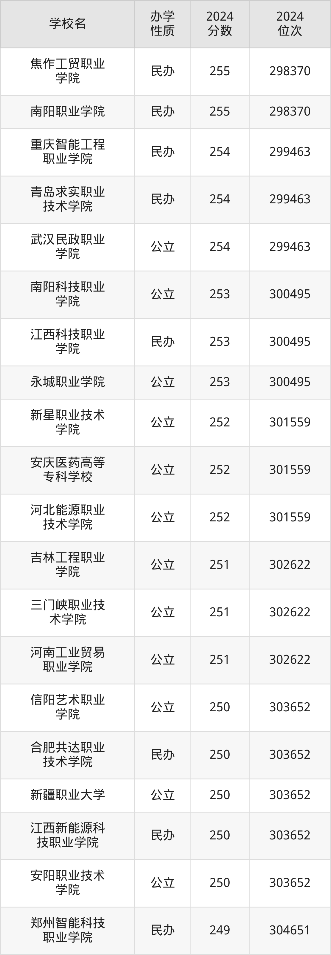 | 南阳职业学院 | 255 | 298370 |