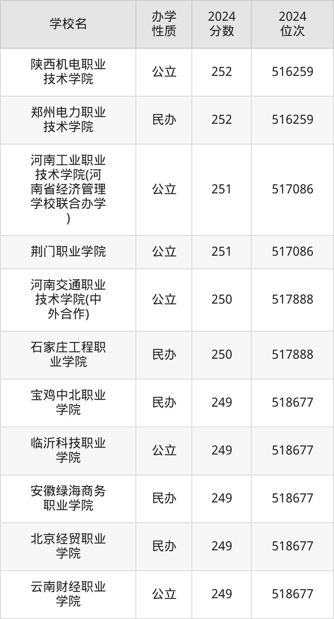 | 郑州电力职业 技术学院 | 252 | 516259 |