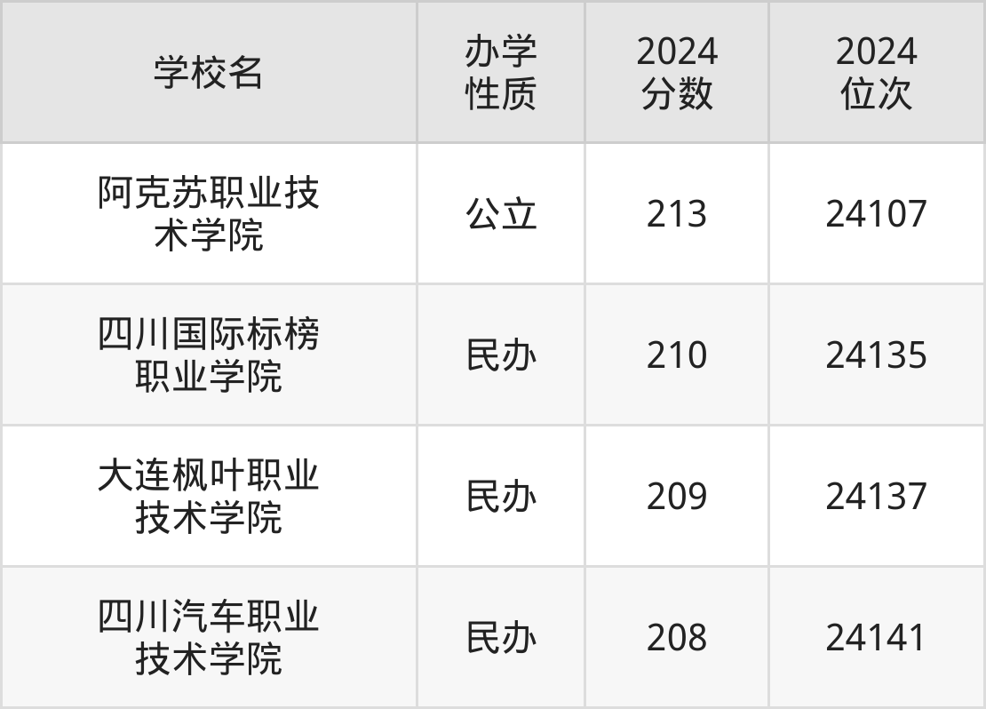 2024年宁夏文科209分考生能上阿克苏职业技术学院、四川国际标榜职业学院、大连枫叶职业技术学院、四川汽车职业技术学院4所专科院校,具体录取分数线及位次为: