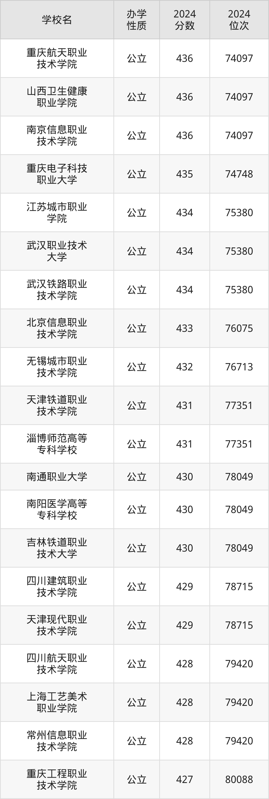 河北431分左右的考生可以上重庆航天职业技术学院、山西卫生健康职业学院、南京信息职业技术学院等院校,刚好在431分的院校有天津铁道职业技术学院、淄博师范高等专科学校。