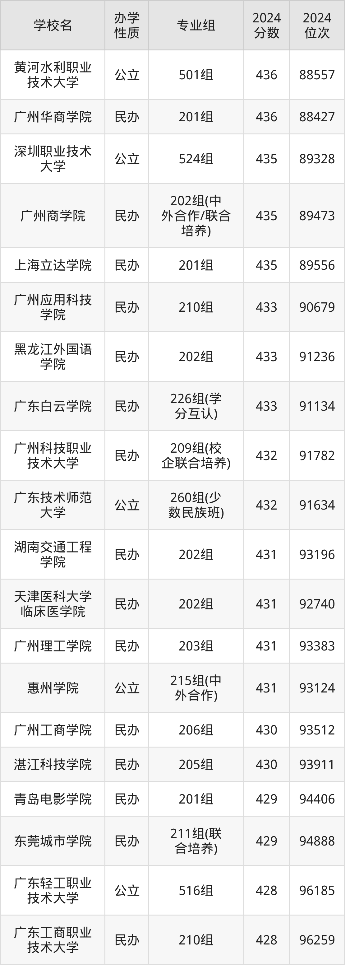 2024年广东历史类431分考生能上广州华商学院、广州商学院、上海立达学院、广州应用科技学院、黑龙江外国语学院等24所二本院校,具体录取分数线及位次为: