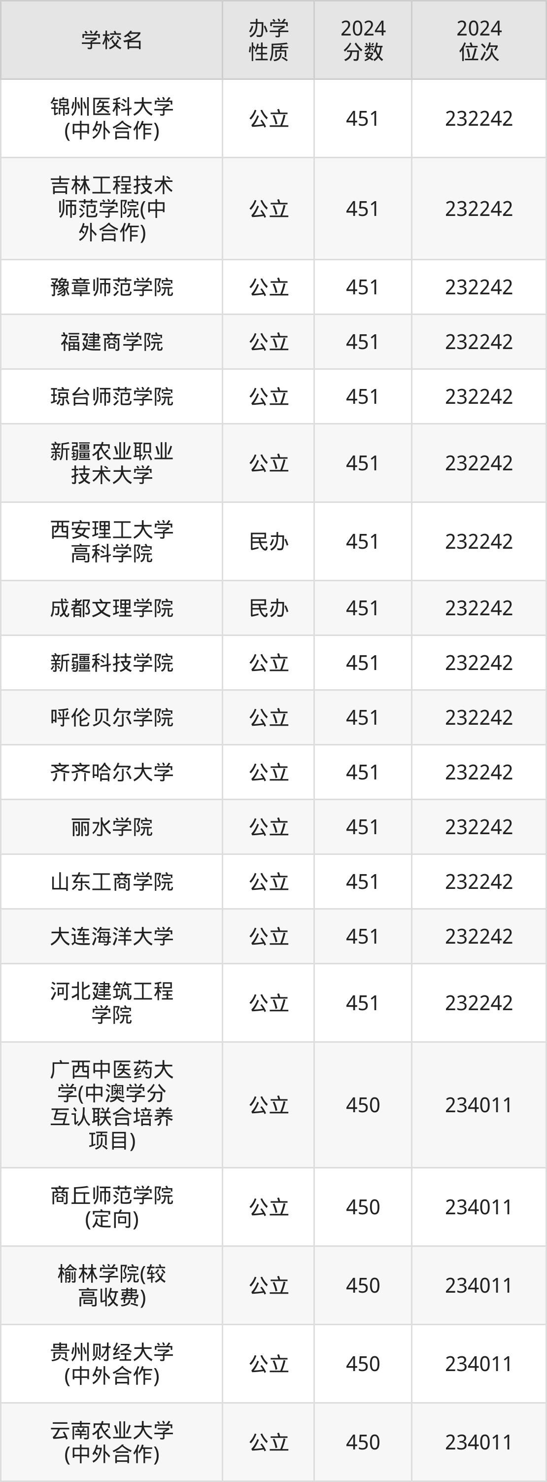 | 锦州医科大学 (中外合作) | 451 | 232242 |