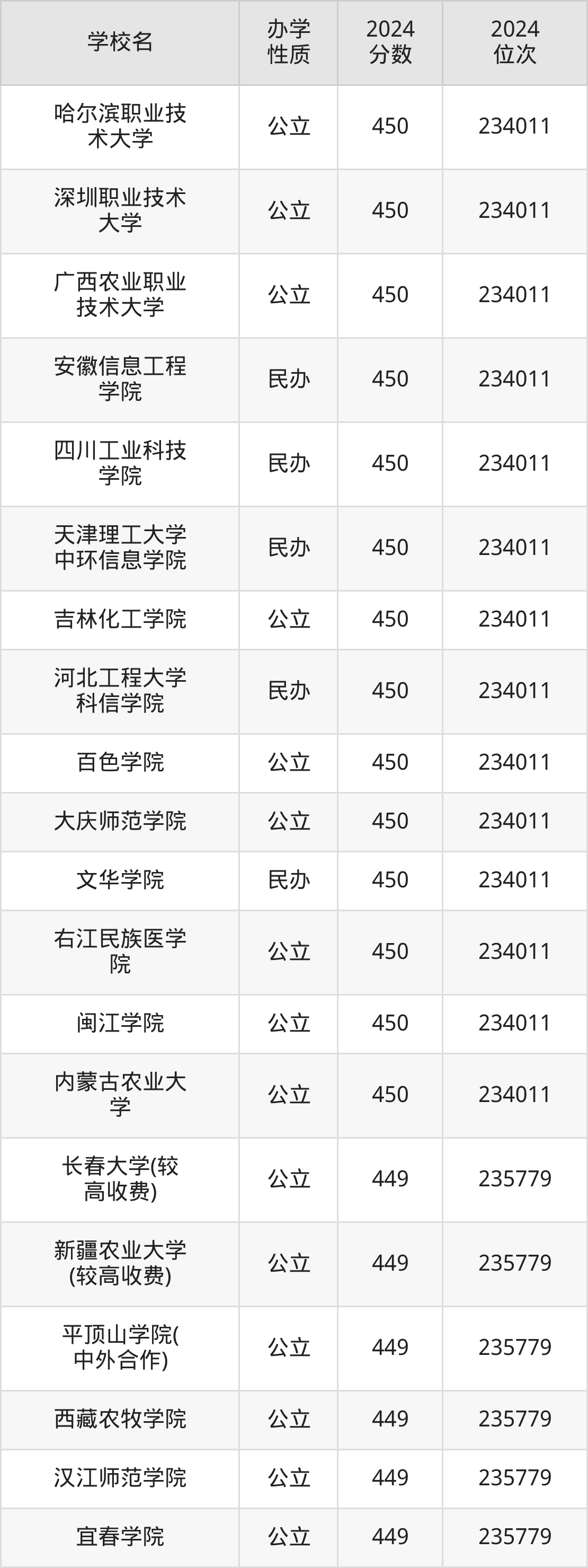 | 长春大学(较 高收费) | 449 | 235779 |
